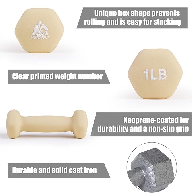 - Comfortable Grip and Anti-Roll Design: The neoprene coating on LIONSCOOL dumbbells offers a comfortable and secure grip and protects fitness equipment from getting damaged. The hexagonal shape of the dumbbell heads prevent the dumbbells from rolling away when setting them down to perform other exercises.