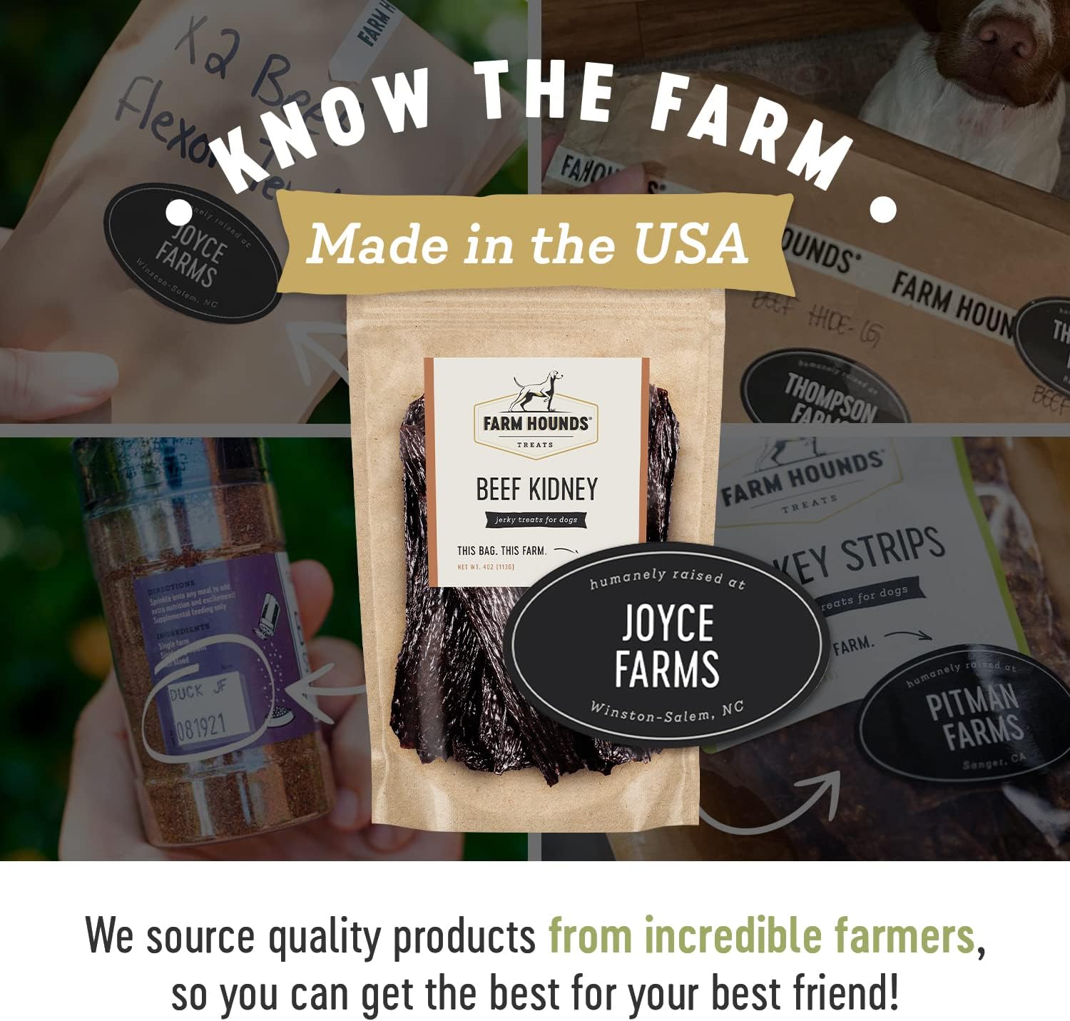 - FARM HOUNDS - At Farm Hounds, we believe healthier animals are happier animals. With your canine in mind, we make all of our treats nutritionally beneficial and delicious. Our close relationship with all-American family farmers who raise their animals in a humane way, helps us use premium raw materials for our products.