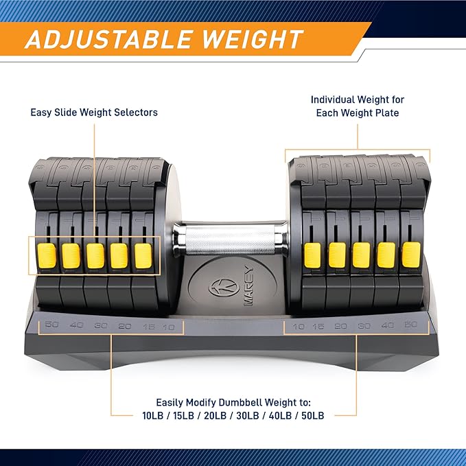 - Adjustable Dumbbell System by Marcy Includes: Adjustable dumbbell with 10 adjustable weight plates, totaling 50lbs