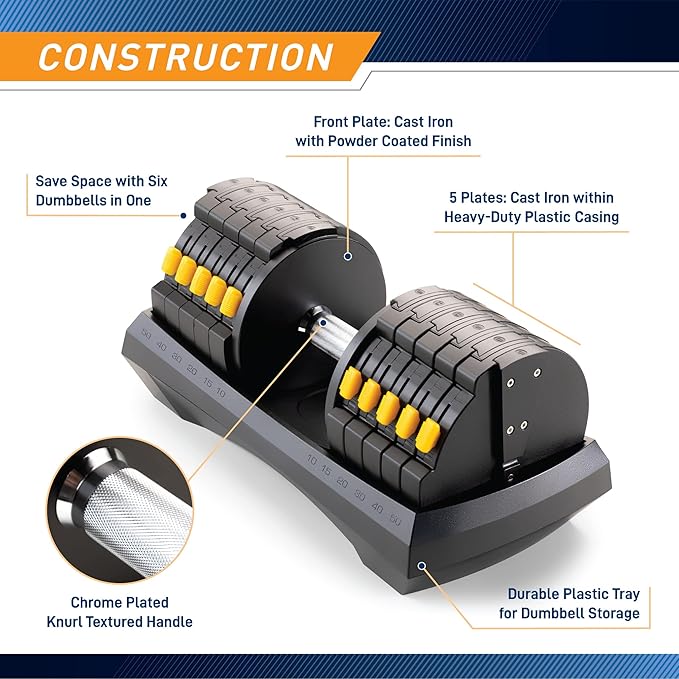 - Modify your dumbbell between 10lbs and 50lbs – 10lb / 15lb / 20lb / 30lb / 40lb / 50lb