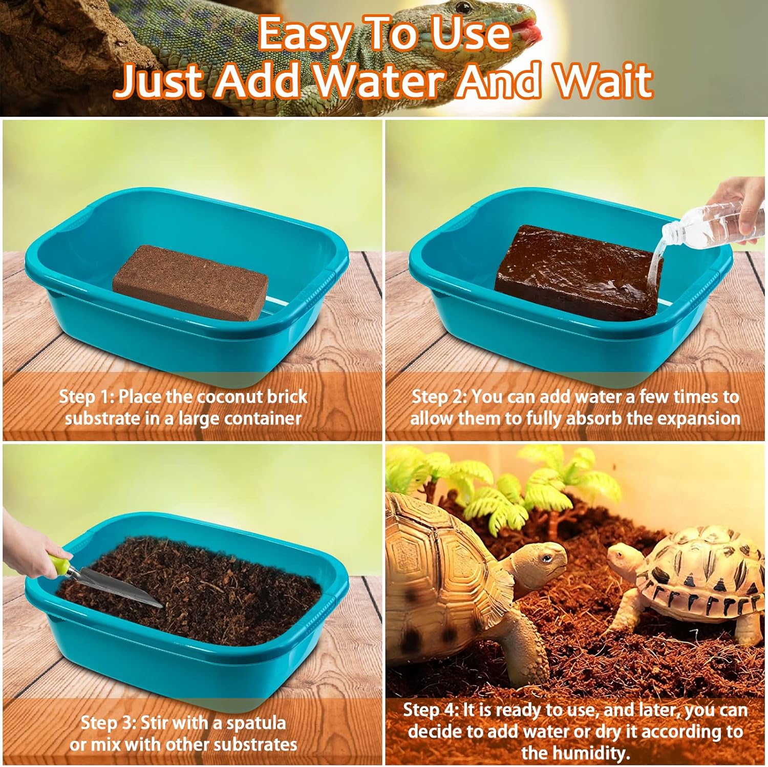 - Easy to Use and Store: These coco bricks are compressed and dense. Just soak the brick in water, coco coir will instantly and easily soak up water and expand into a clean, fluffy substrate. Our Coconut husk fiber is a great substrate for any reptile or amphibian that needs a substrate / bedding that can retain moisture