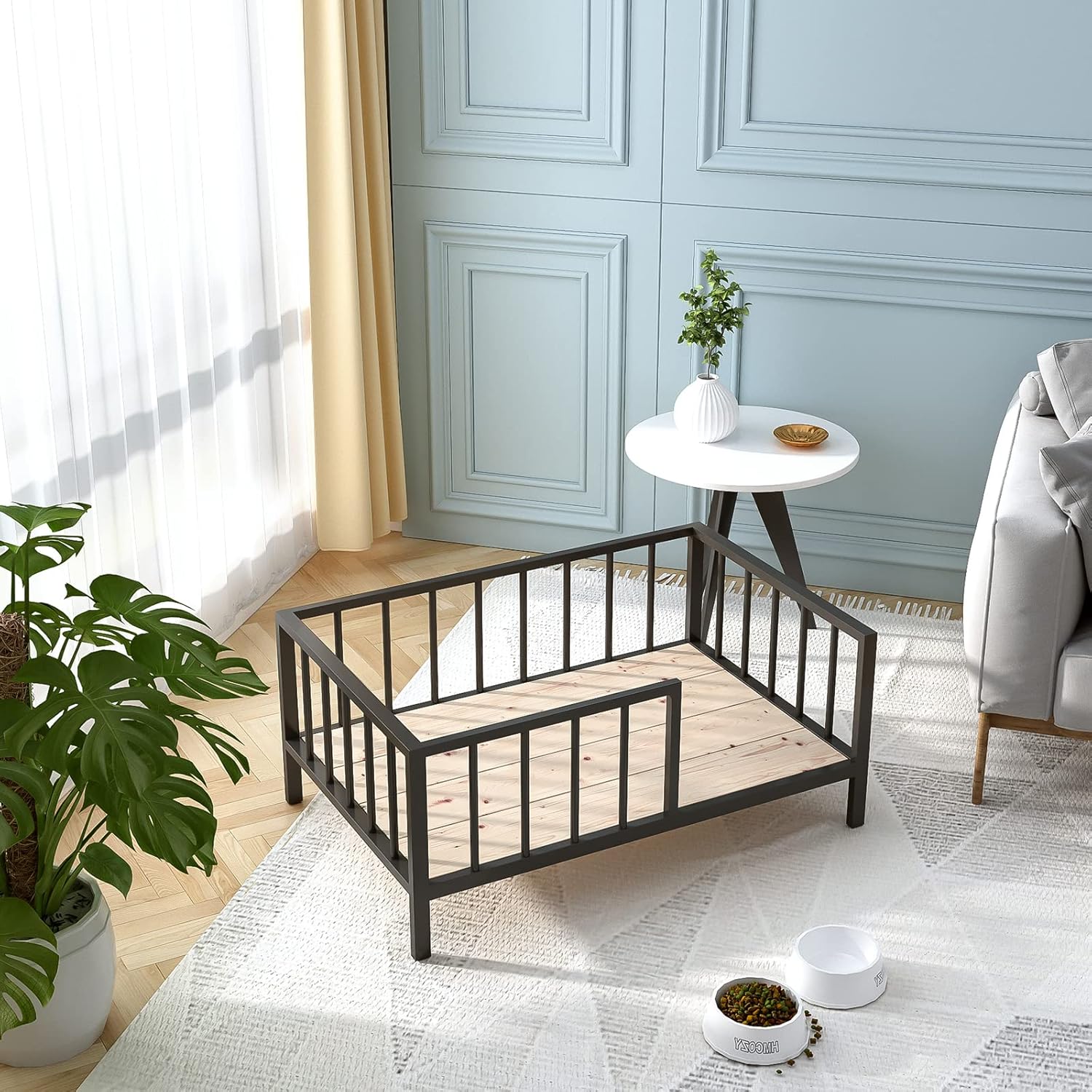 Dog Bed with Rails - Elevated Pet Metal Bed Frame with Solid Wood Board and Washable Soft Mat for Medium Dog Indoor or Outdoor Use, 25.2" x 37.8", Black