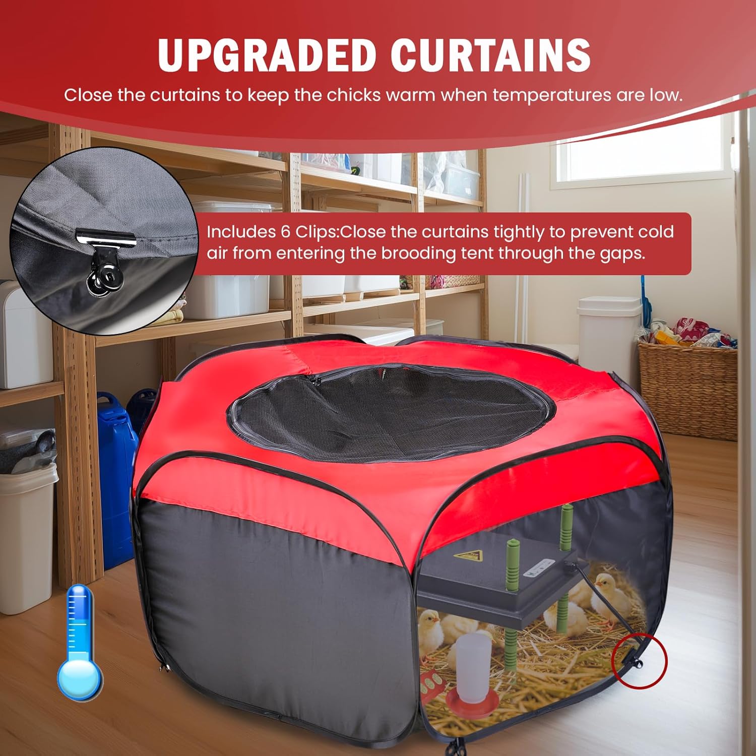 - INDOOR & OUTDOOR USE - Perfect for indoor or outdoor settings, this baby chick brooder features an advanced double-door design, three-sided mesh design, and escape-proof mesh. The warm curtains is perfect for outdoor, providing excellent cold protection. Indoors you can open the breathable mesh panels, which offer good ventilation to ensure a cool and comfortable environment. while also preventing the chicks from escaping. This playpen will keep your chicks safe, happy, and comfortable.