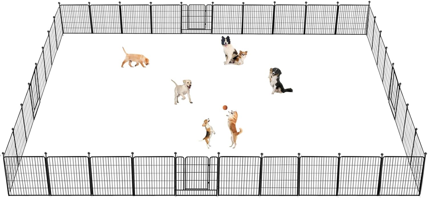 - 【Rust-proof & Heavy Duty Metal】: Made of heavy duty metal with thickened steel wire panels and a double-layer coating process, our dog playpen outdoor is rust-proof and waterproof, the sturdy construction prevents the pet play pen being push over by dogs. The outdoor dog fence can be used outside without worry. The dog pen indoor designed with anti-slip foot pads and flat bottom stakes prevent floor damage when used indoors