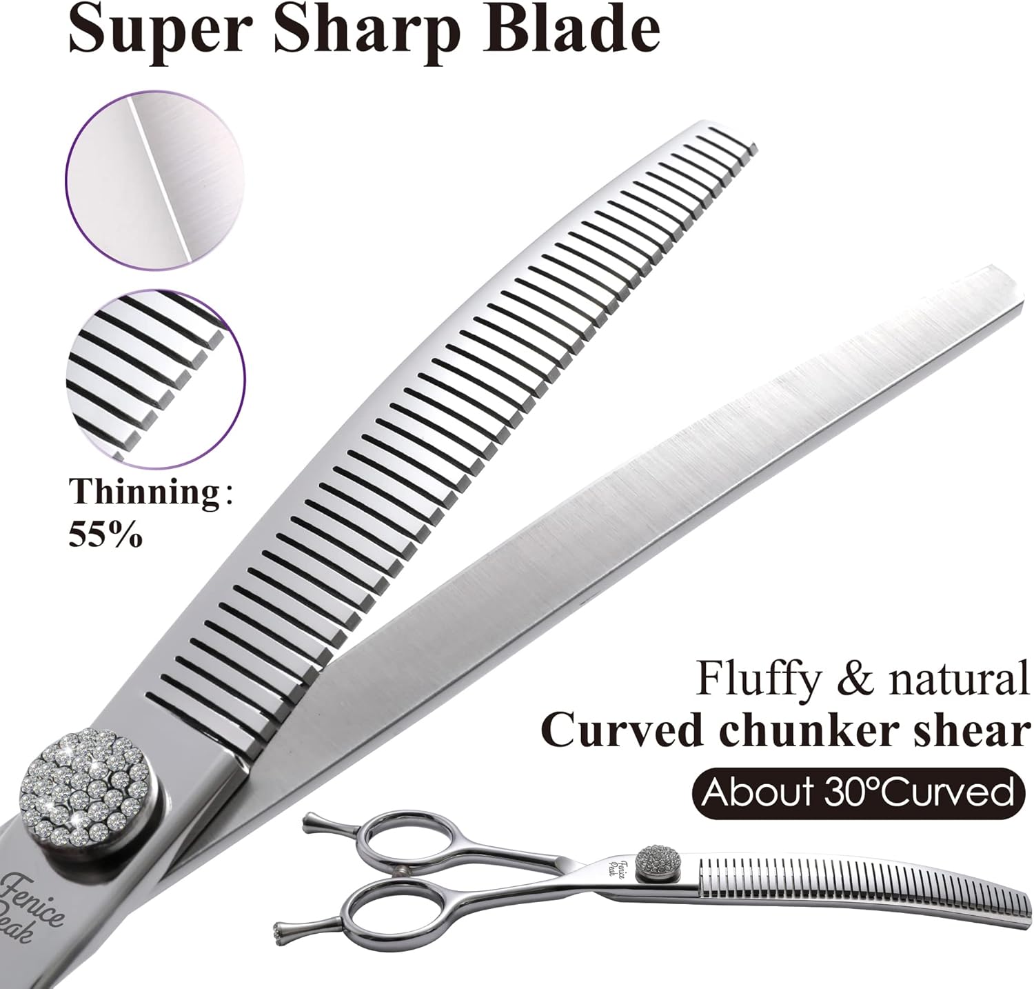 Fenice Peak 6.5‘’ Curved Thinning Dog Grooming Scissors with Jewelled Screw 440C Stainless Steel Pet Grooming Bulking Shears with Symmetrical Handle and Decorative Tail Nails Fluffy Scissors