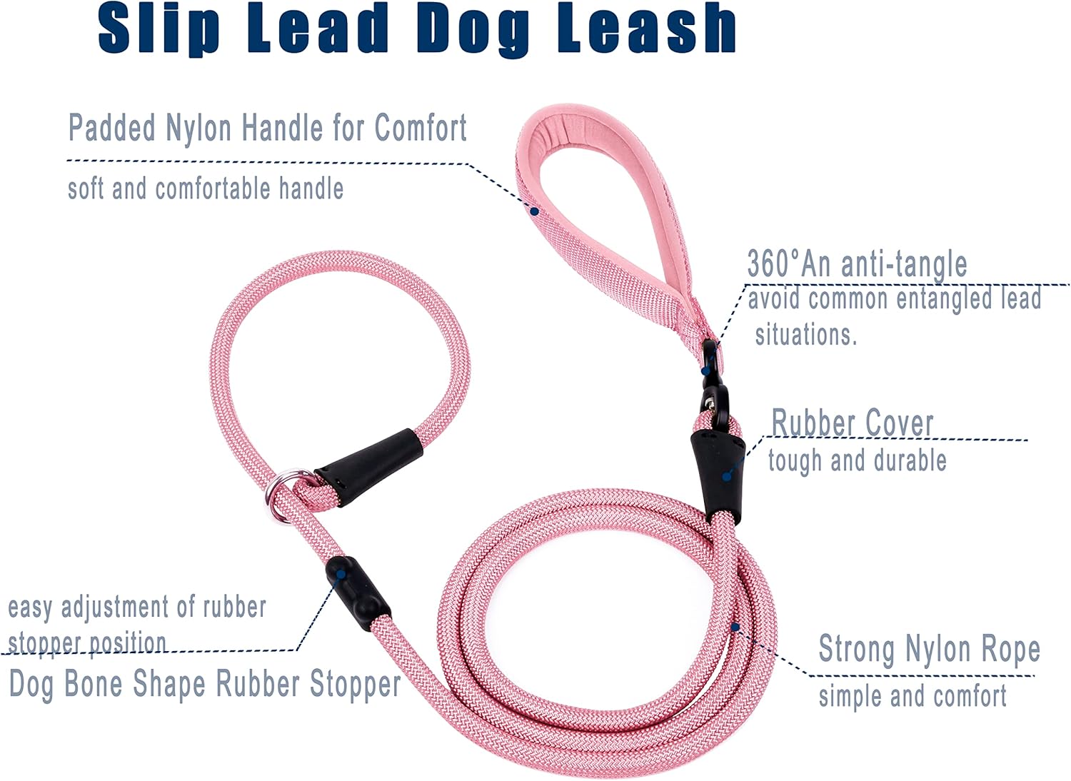 - Customized Slip Lead: An anti-tangle slip lead that is stiff enough for walking your dog, yet soft enough to move freely. When your dog moves in different directions (especially when walking multiple dogs), this lead will not tangle because it is constructed to move in line with your dog's movement, not the other way around, to avoid the very common tangling lead situation.