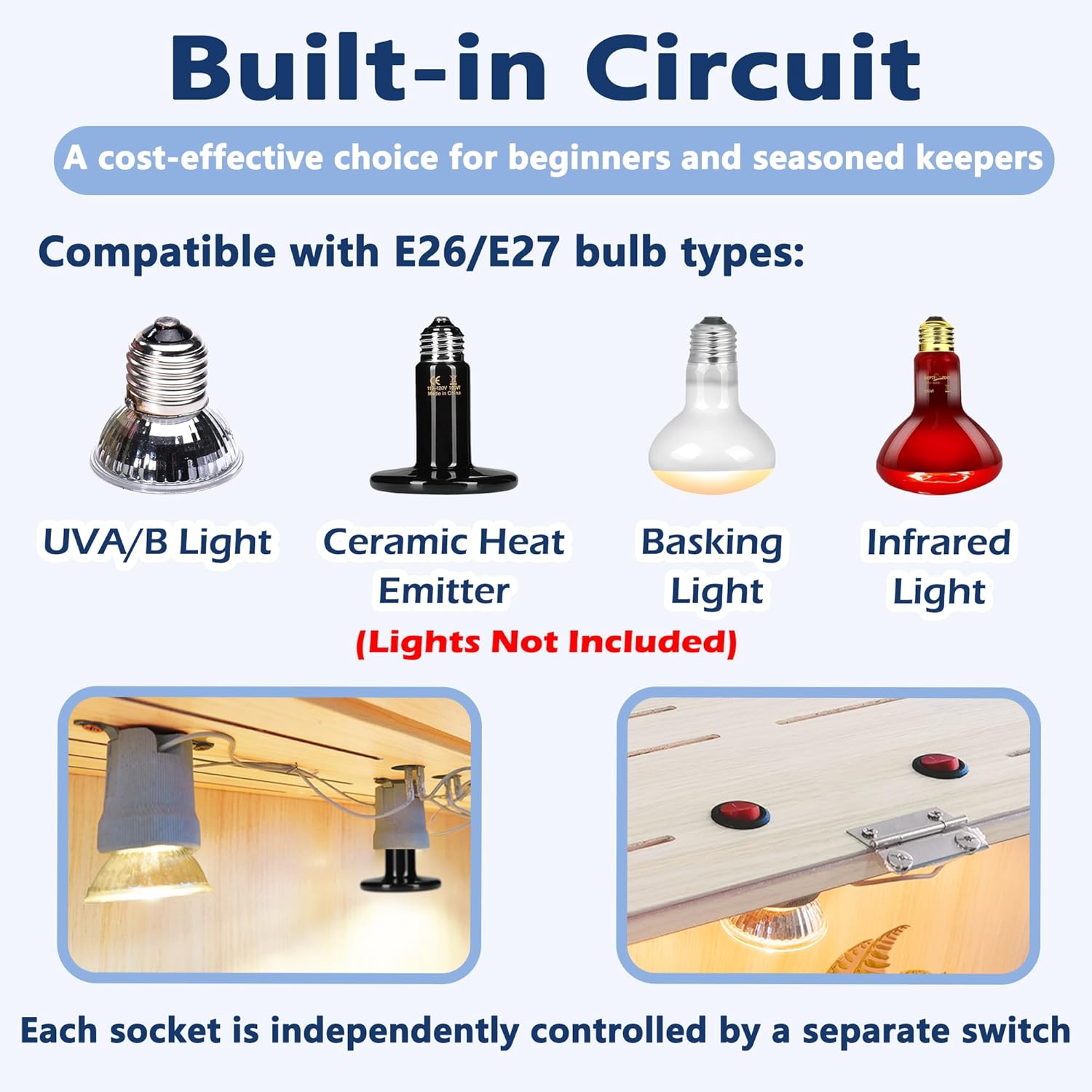 - 【Convenient Bulb Sockets】Equipped with built-in bulb sockets and switches (three in the 40/48-inch version), our terrarium accommodates various E27 bulbs for heating, lighting, and night illumination (bulbs not included). Installing the lights is a breeze, making it an ideal habitat for your reptiles.