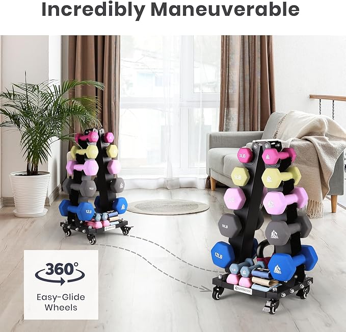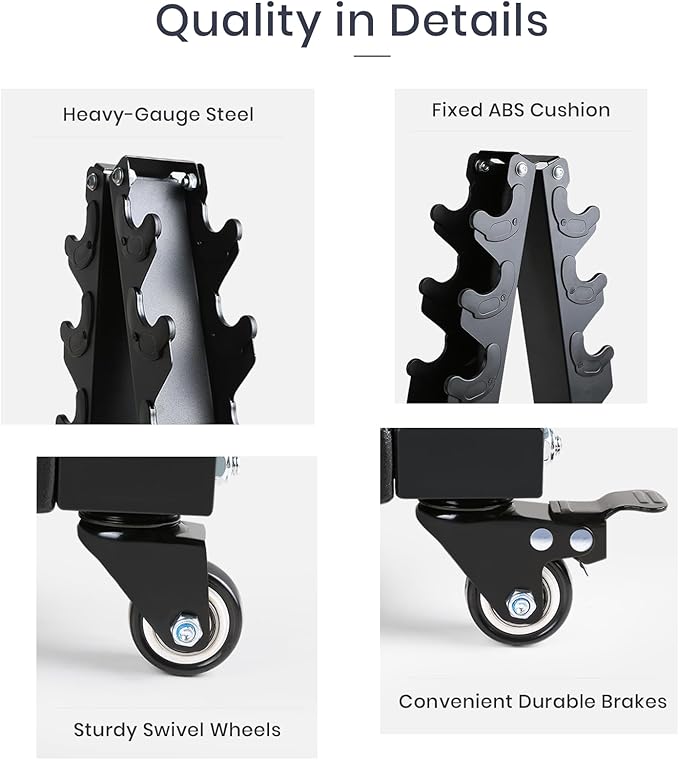- Maneuverable Sturdy Wheels: 360-degree swivel wheels enable quiet and smooth rolling even with heavy load on it, making it extremely easy to bring your dumbbells to you. Protected by a PU layer, wheels roll silently with lifetime durability. Two of the four casters also have an integrated brake to keep the dumbbell rack in place.
