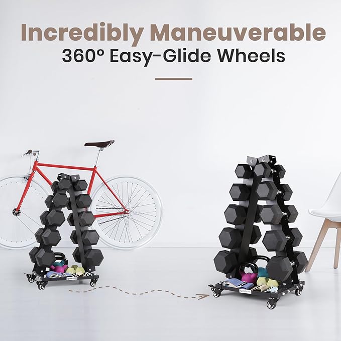 - Maneuverable Sturdy Wheels: 360-degree swivel wheels enable quiet and smooth rolling even with heavy load on it, making it extremely easy to bring your dumbbells to you or push it outdoors on a nice day. Protected by a PU layer, wheels roll silently with lifetime durability. Two of the four casters also have an integrated brake to keep the dumbbell rack in place.