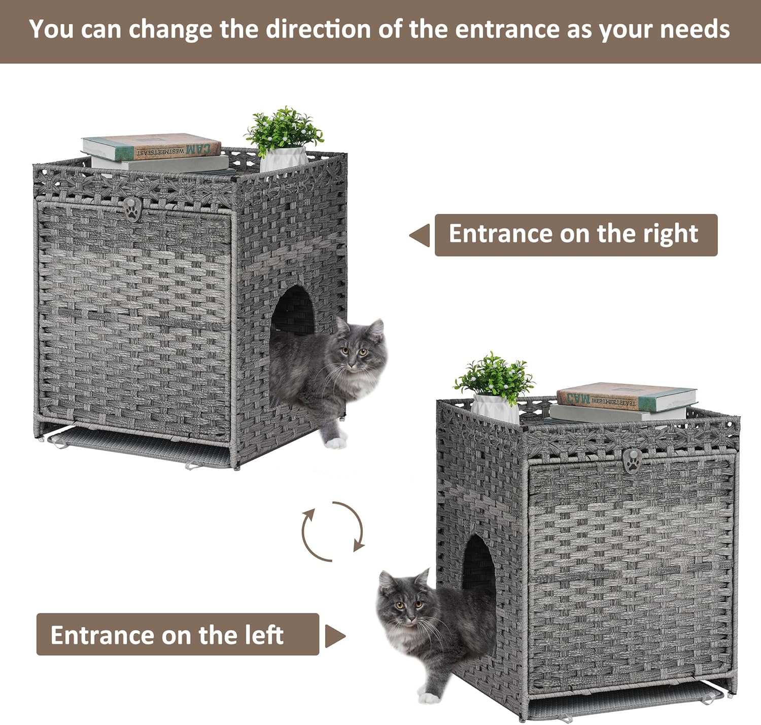 Cat Litter Box Enclosure with Soft Litter Mat; Hidden Kitten Washroom Furniture with Door; Handwoven Rattan Cat House; Pet Crate for Living Room, Bedroom, Balcony (Grey)