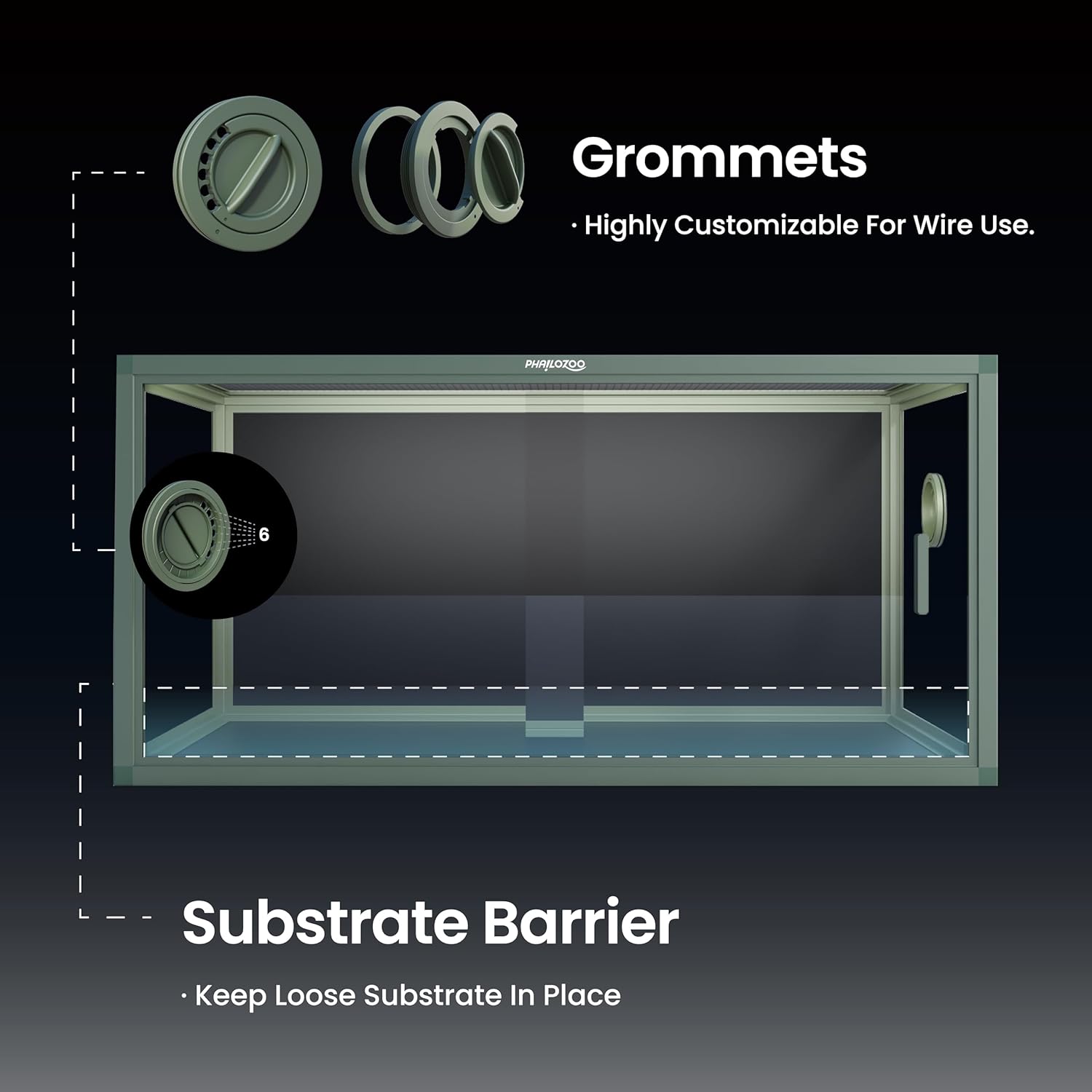 - 【Easy Maintenance】Front opening reptile terrarium with door handles included for easy cleaning & feeding. No more suction cup problems or unsightly fingerprints all over. The substrate barrier keeps the substrate in place. Our tempered glass doors are durable enough to withstand scratching.