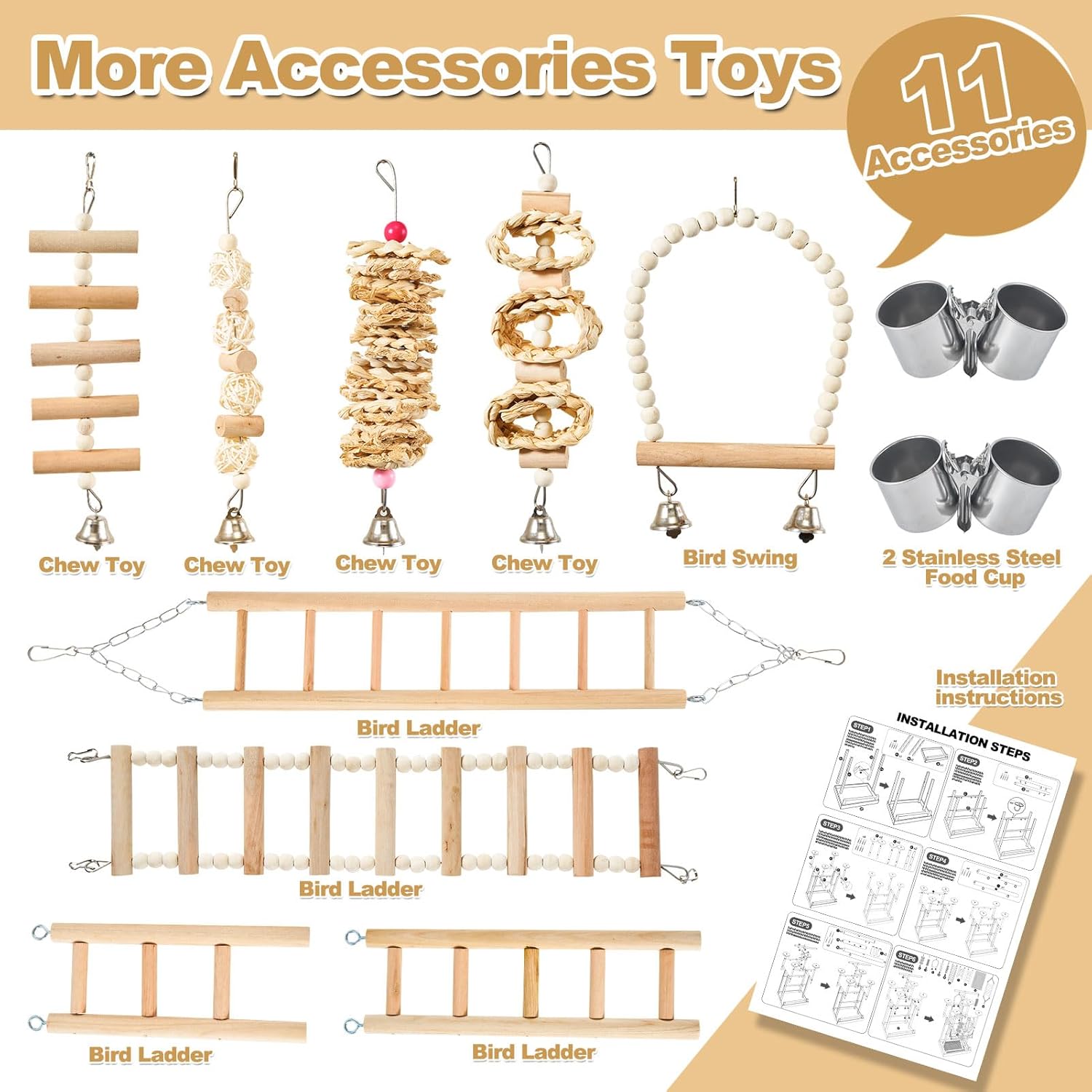 - Challenging and Stimulating Bird Toys: Keep your feathered friend entertained and mentally stimulated with a variety of toys including ladders, chewing toys, and a bird swing. They can explore different heights, fly or hop between areas, and climb up and down. This helps keep their beak busy and promotes physical and mental activity