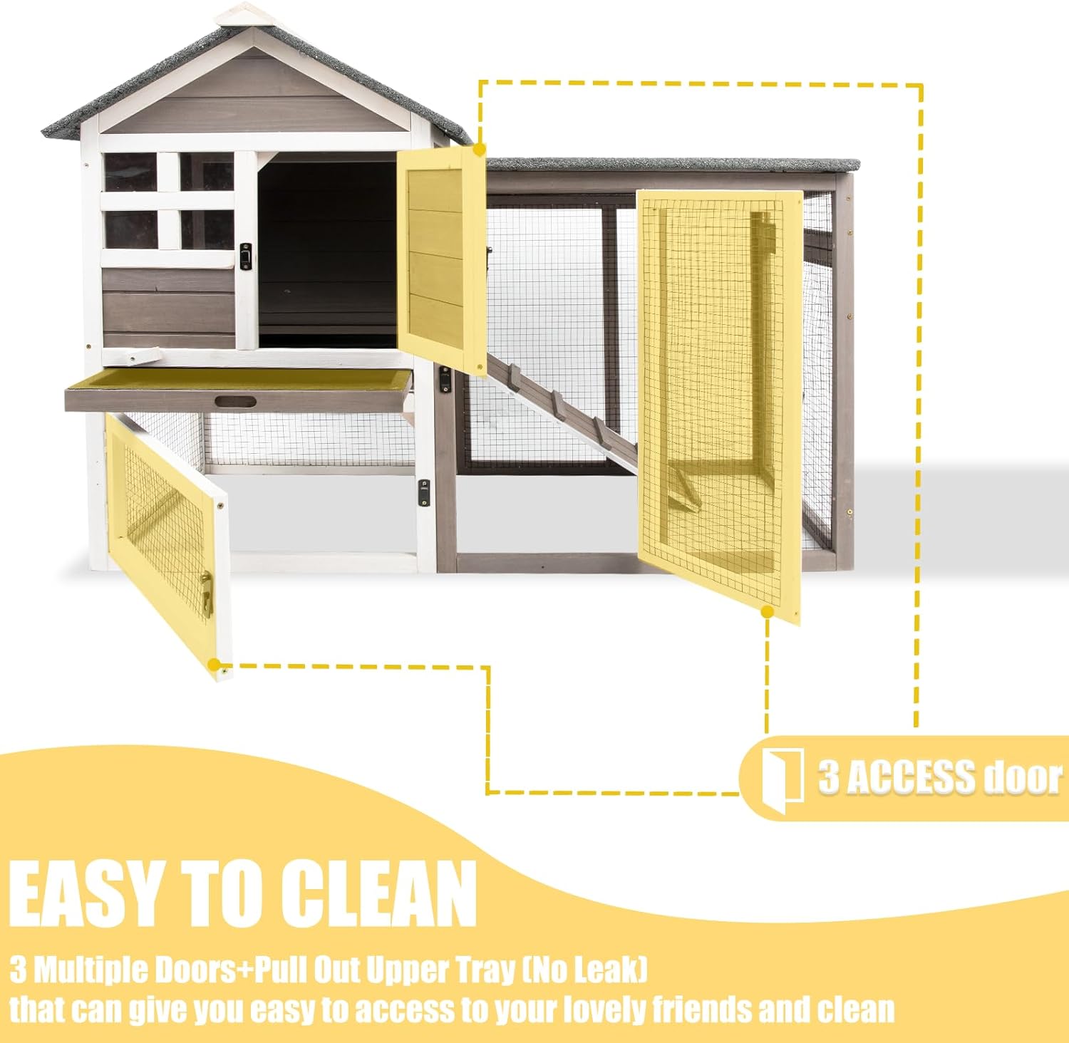 - 🐇【EASY TO CLEAN Pull-out Tray & 3 Entry Doors】 - The Bunny hutch with DEEPER pull out tray make clean easily. Our trays also have a lockable design.We also added a locker for the tray for Enhance the stability and prevent the tray from accidentally falling off.