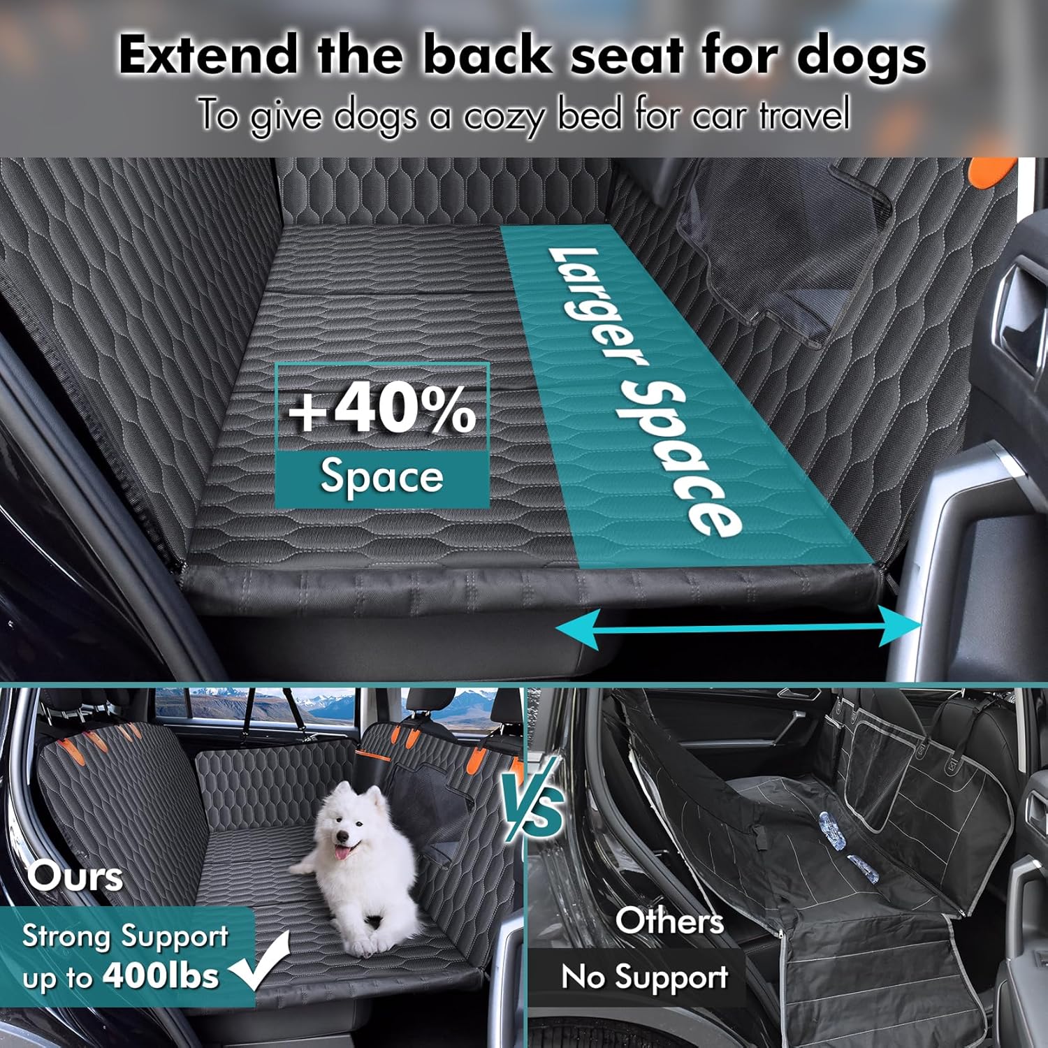 Back Seat Extender for Dogs-Supports 400lb,Waterproof Dog Car Seat Cover Hard Bottom-Detachable,600D Heavy Duty Scratch Proof Nonslip Soft,Dog Hammock for Car,SUVs