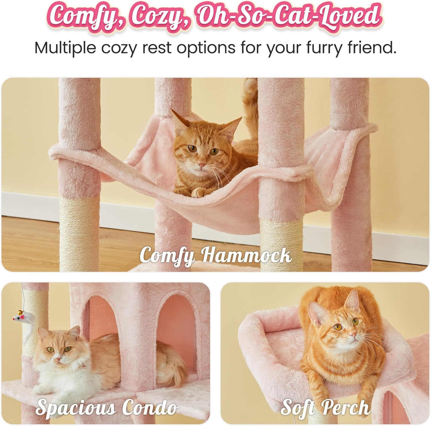 MWPO 70.1-Inch Pink Large Cat Tree, Multi-Level Tall Cat Tower for Indoor Cats, Plush Cat Condo with Big Padded Perches, Sisal-Covered Scratching Posts, Hammock, Toys for Kittens & Cats