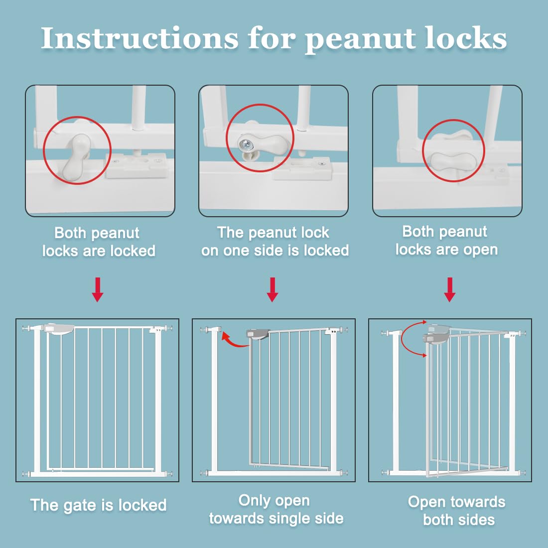- 【Multiple modes】 Our triple lock gate has various statuses to meet your multiple needs in life. When all three locks are locked, little babies or pets will be stopped by it. At the bottom , there are two peanut locks to control the opening direction and locking. If the peanut lock on one side is locked, the gate can only be opened towards single side. If both peanut locks are open, the gate can swing both ways. Besides, it will stay open at 90 degrees and auto-close when it's less than that.