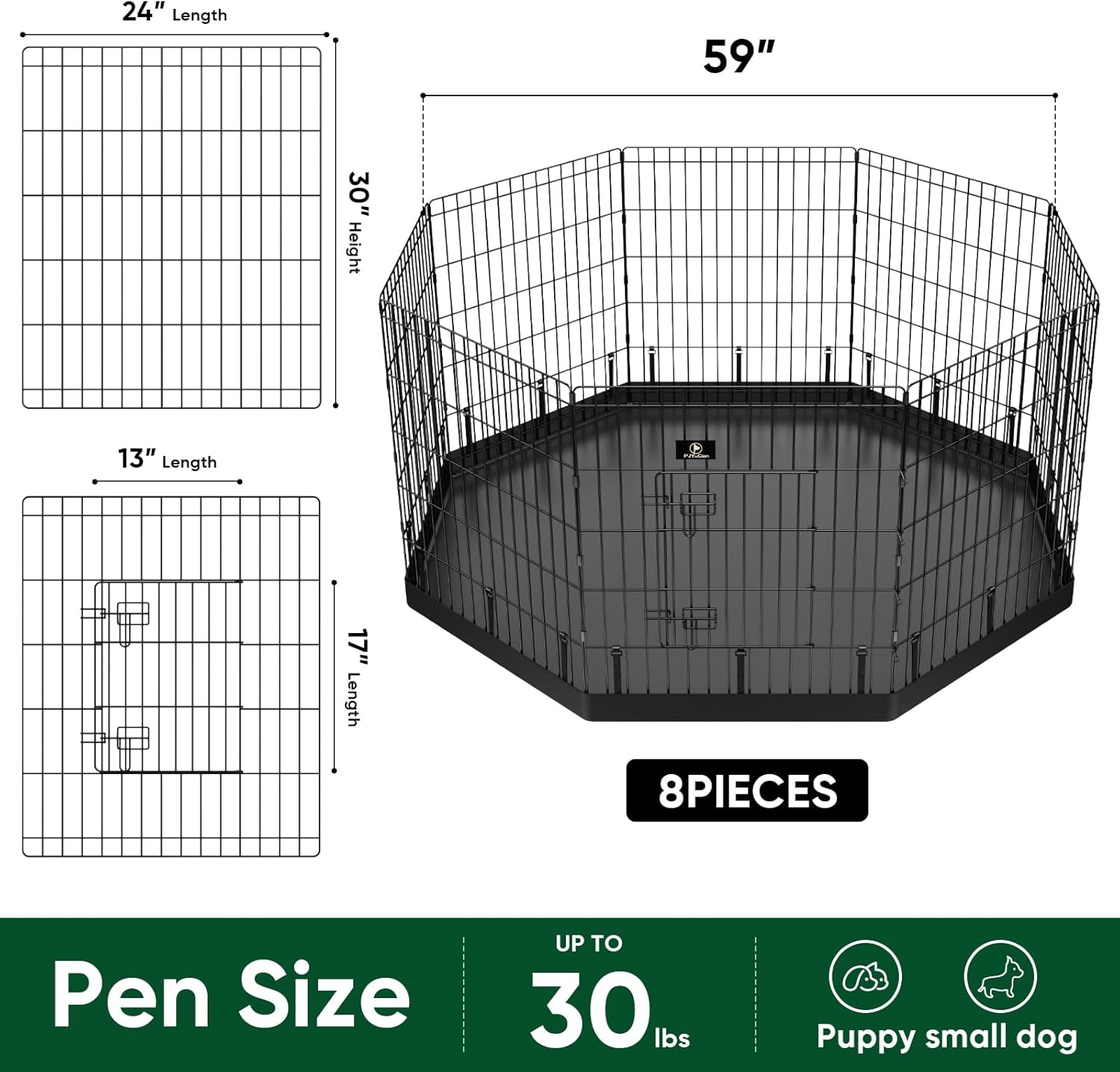 - 30" H x 24" W Foldable Puppy Playpen This Puppy Playpen consists of 8 connected panels (each panel measures 30" H x 24" W), making it easy to set up and take down. The foldable design allows for convenient storage and transport. No tools are required, and it can be quickly assembled by one person. Better for puppy or small pet.