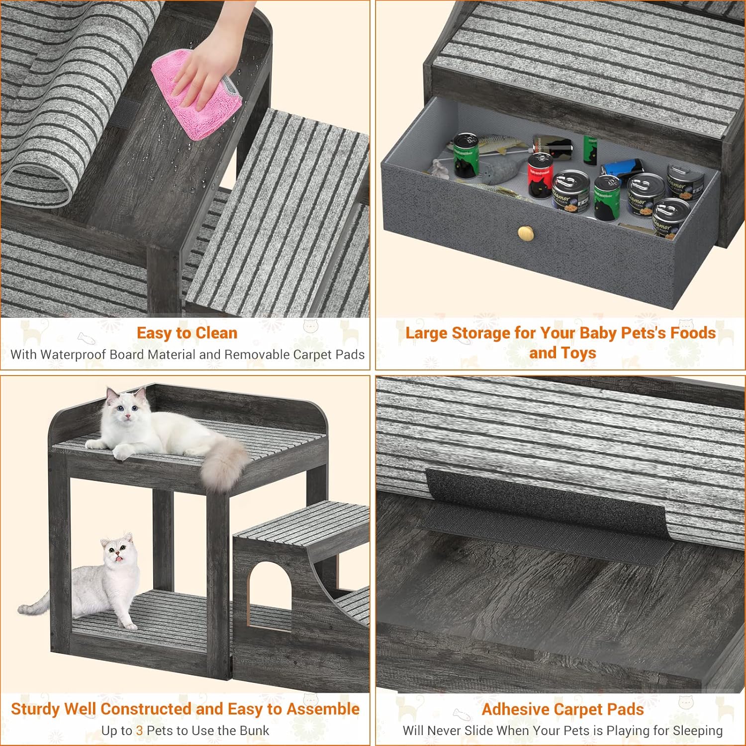 - 🐾 Large Space with a Storage Drawer - The space underneath the bed is large too, so your dogs and cats can play together. The top bed space is 17.72*17.72 inches, providing a safe and large space to lie down and rest. It can hold up to 150 lbs. The drawer underneath the stair is large too, you can install your pet's toys and food too.