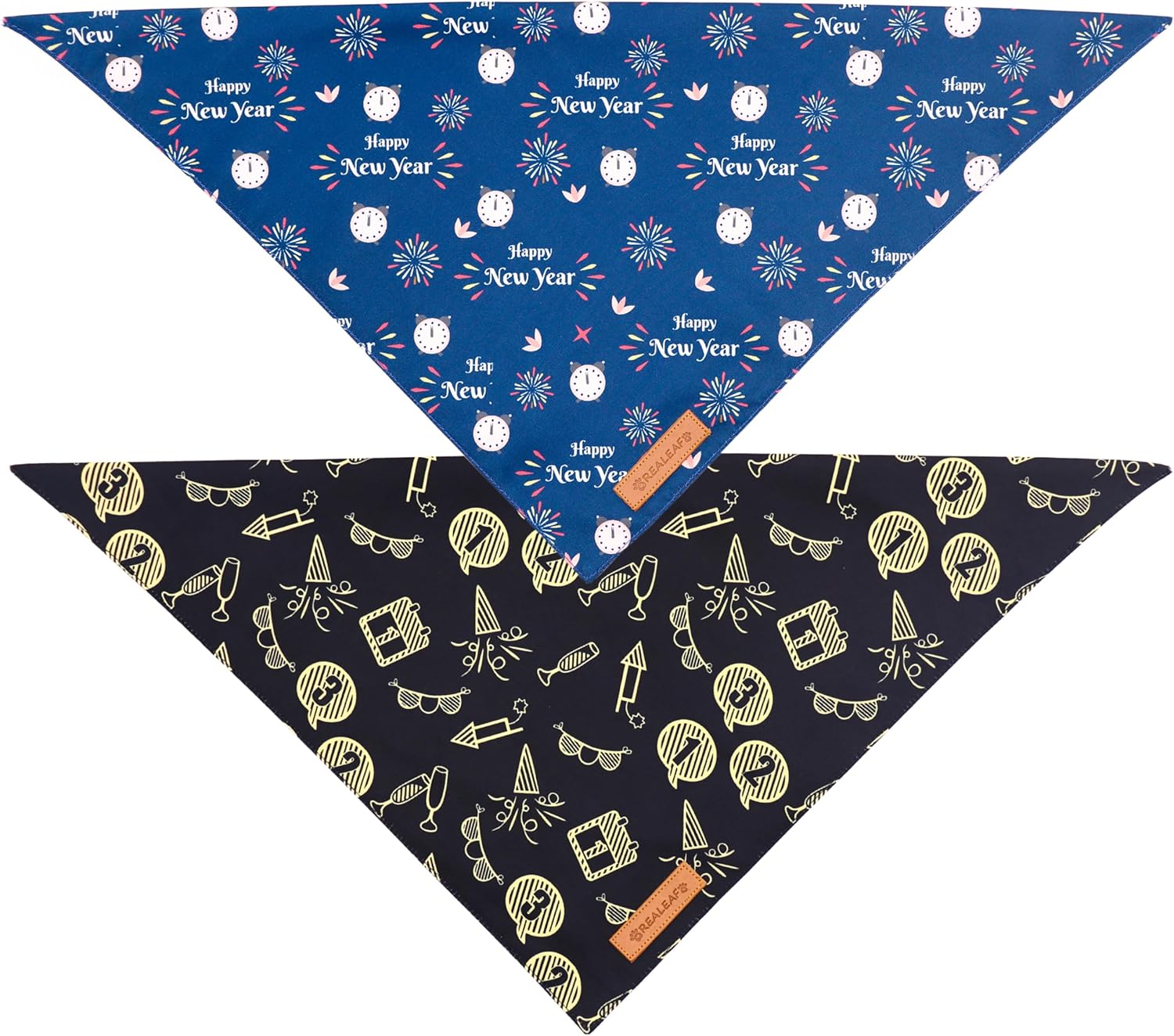 Realeaf Happy New Year Dog Bandanas 2 Pack, Reversible Holiday Pet Scarf for Boy and Girl, Premium Durable Fabric, Bandana for Small Medium Large and Extra Large Dogs (Small)