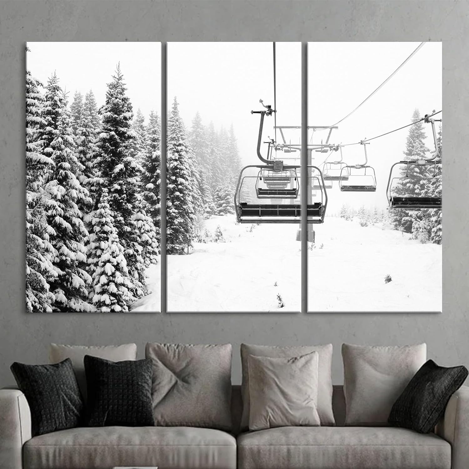Nature Wall Art Prints - Ocean Forest Mountain Lake Canvas Landscapes - Small to Extra Large Living Room Bedroom Kitchen Bathroom Décor (Ski Lift on Snowy Mountain, 35L" x 53W" - 3 Panels)