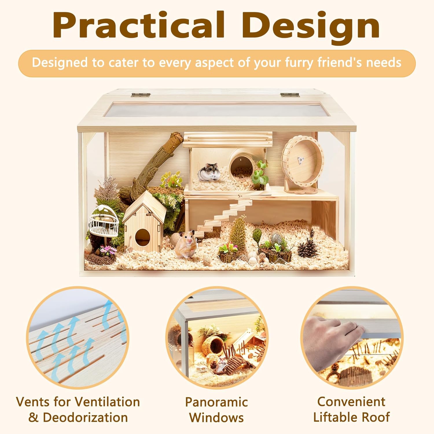 - 【Premium Craftsmanship】Our hamster enclosure is expertly constructed from strong, high-density natural wood with a corrosion-resistant and waterproof coating, ensuring it remains resistant to moisture and corrosion. The cage's windows are made from transparent acrylic, enabling you to maintain a clear view of your hamster's activities