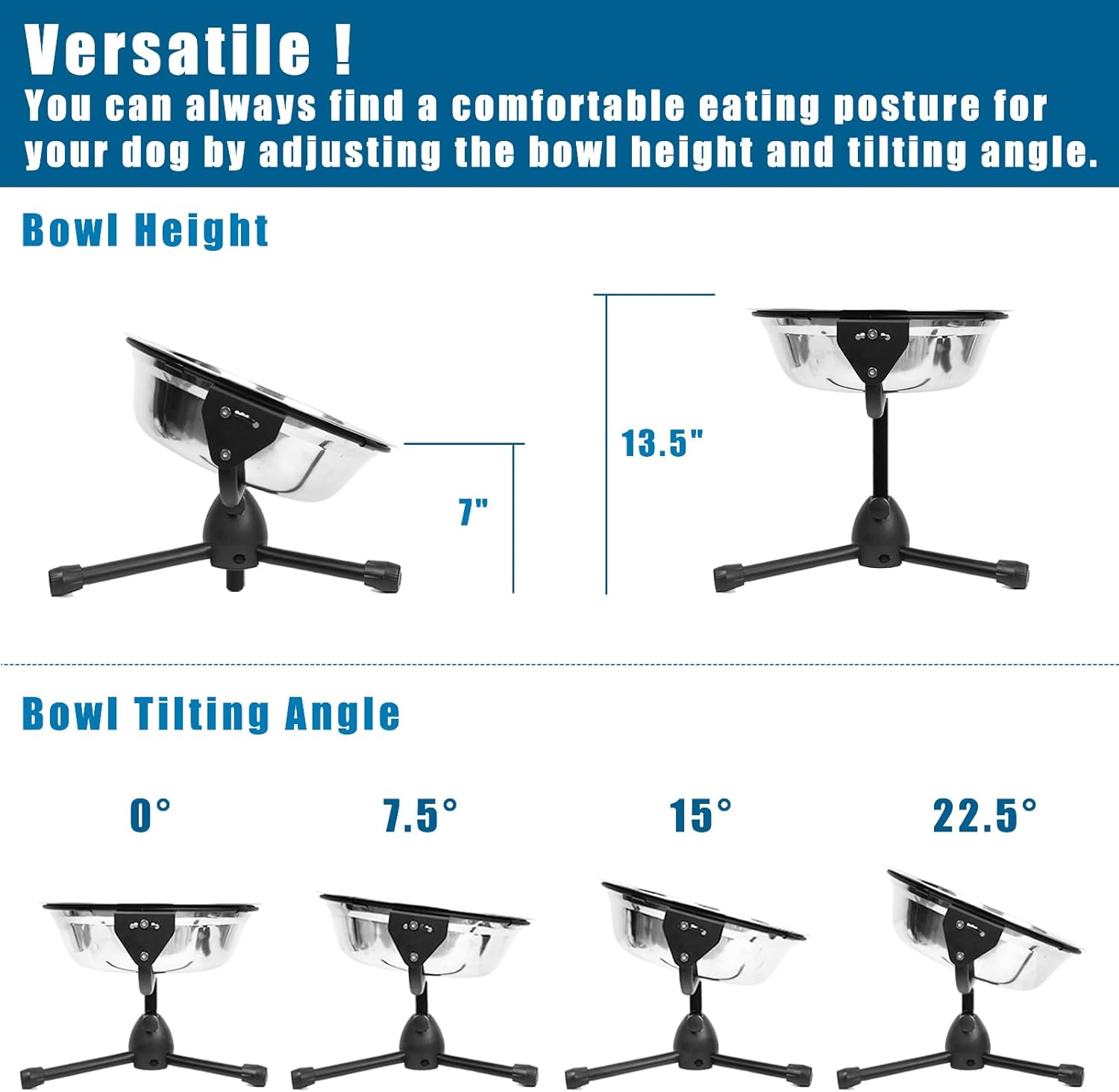 - 【Bowl Tilt Angles Adjustable】The tilt angle of this medium dog bowl can be 0°, 7.5°, 15°, and 22.5 °. This design is extremely helpful to promote digestion, reduce bloating, neck strain while feeding, and strain on joints. It is great for dogs with arthritis or mobility issues. This personalized dog bowl is good at use as water bowl for dogs as well.