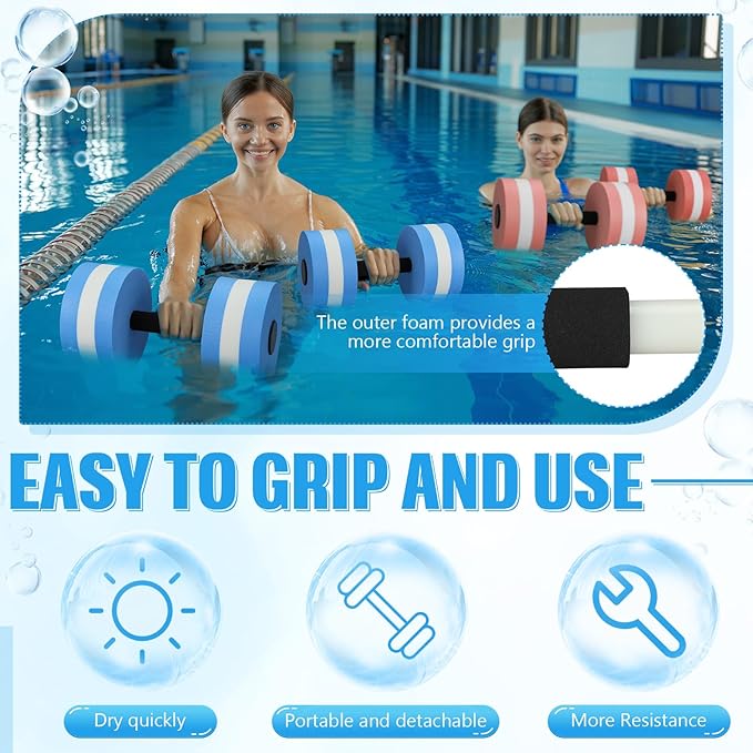 - Reliable Materials: made with quality EVA foam, these durable water dumbbells are designed to be waterproof, lightweight, easy to dry after use, and not easy to break, tear or deform; These pool dumbbells for water aerobics demonstrate low water absorption, providing buoyancy and robust resistance in water workouts, making them an ideal choice for a reliable, long term use