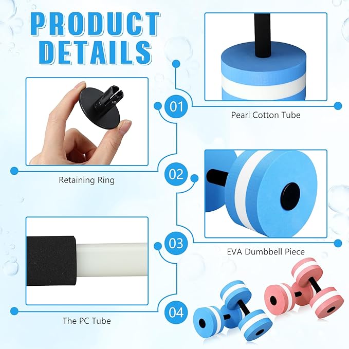 - Package Contains: there are 4 mixed colored water weights dumbbells (2 blue and white, 2 pink and white); These aquatic dumbbells are of quality material and vibrant colors, both meeting your daily use and sharing needs; Also, they're lightweight, portable, simple to assemble and disassemble, making them ideal for carrying to your favorite workout place