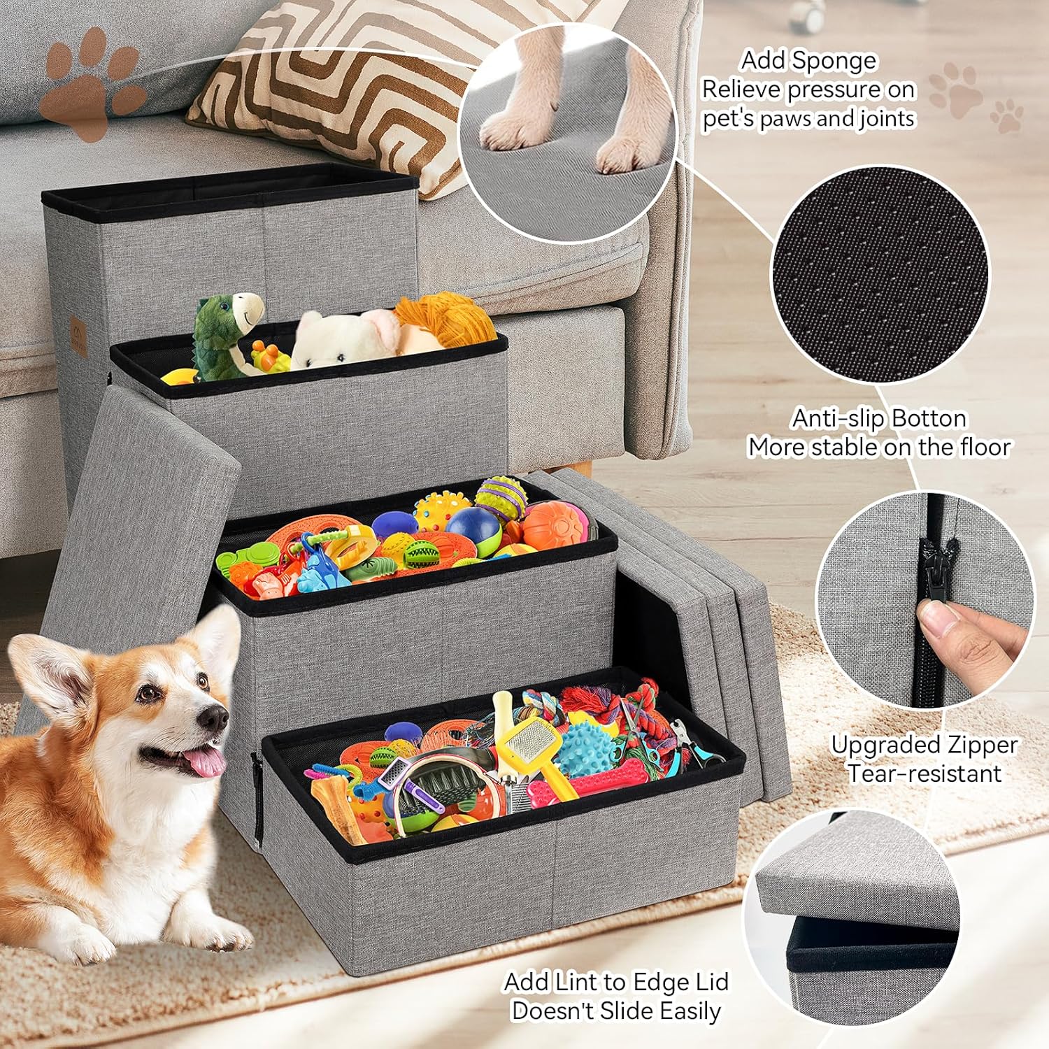 - 3-IN-1 DOG STAIRS AND CONDO: Zerbuger pet stairs not only provide a stable and cozy place for your pet to rest, but also serve as a convenient 106.6QT large storage area for your pet's clothes, toys, or any other supplies. Our pet steps are covered with removable lids, Every steps are designed as storage boxes.