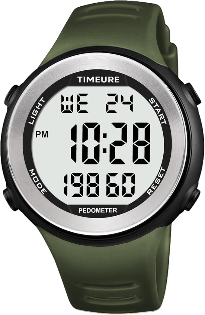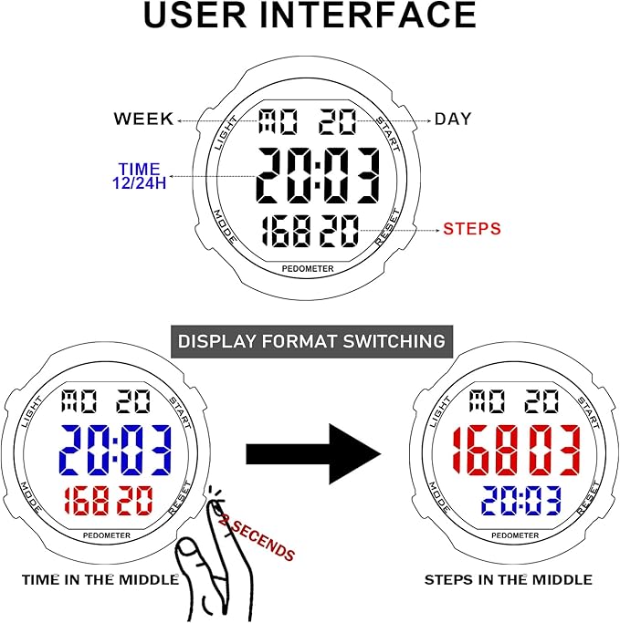 - Illuminated Convenience: Equipped with a large dial and LED backlight, our pedometer watch ensures effortless readability, even in dimly lit environments. Ideal for outdoor activities like hiking, camping, and swimming