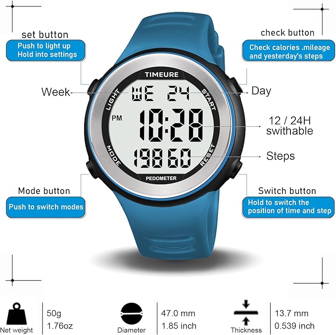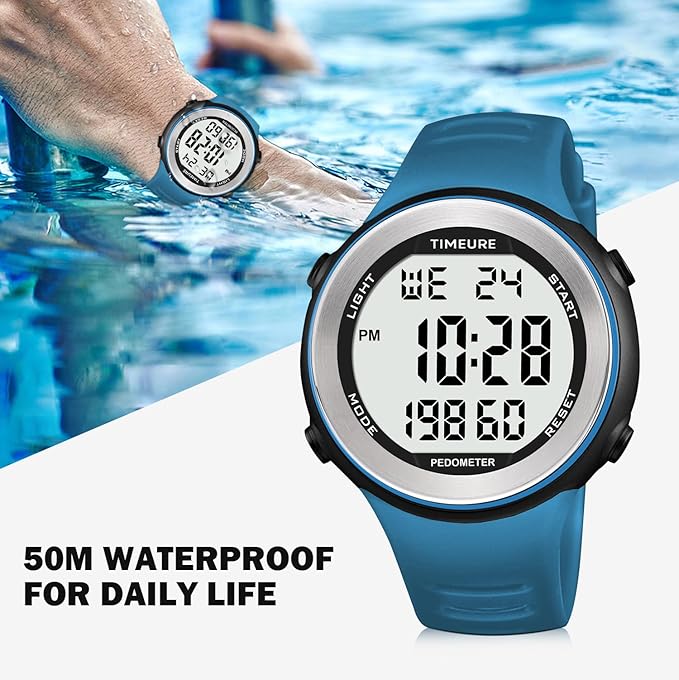 - Dive into Adventure: With its impressive 50m waterproof rating, this watch is suitable for handwashing and swimming. It offers a range of practical features, including time, date, week display, alarm, hourly chime, pedometer, calorie counter, stopwatch, and countdown timer.