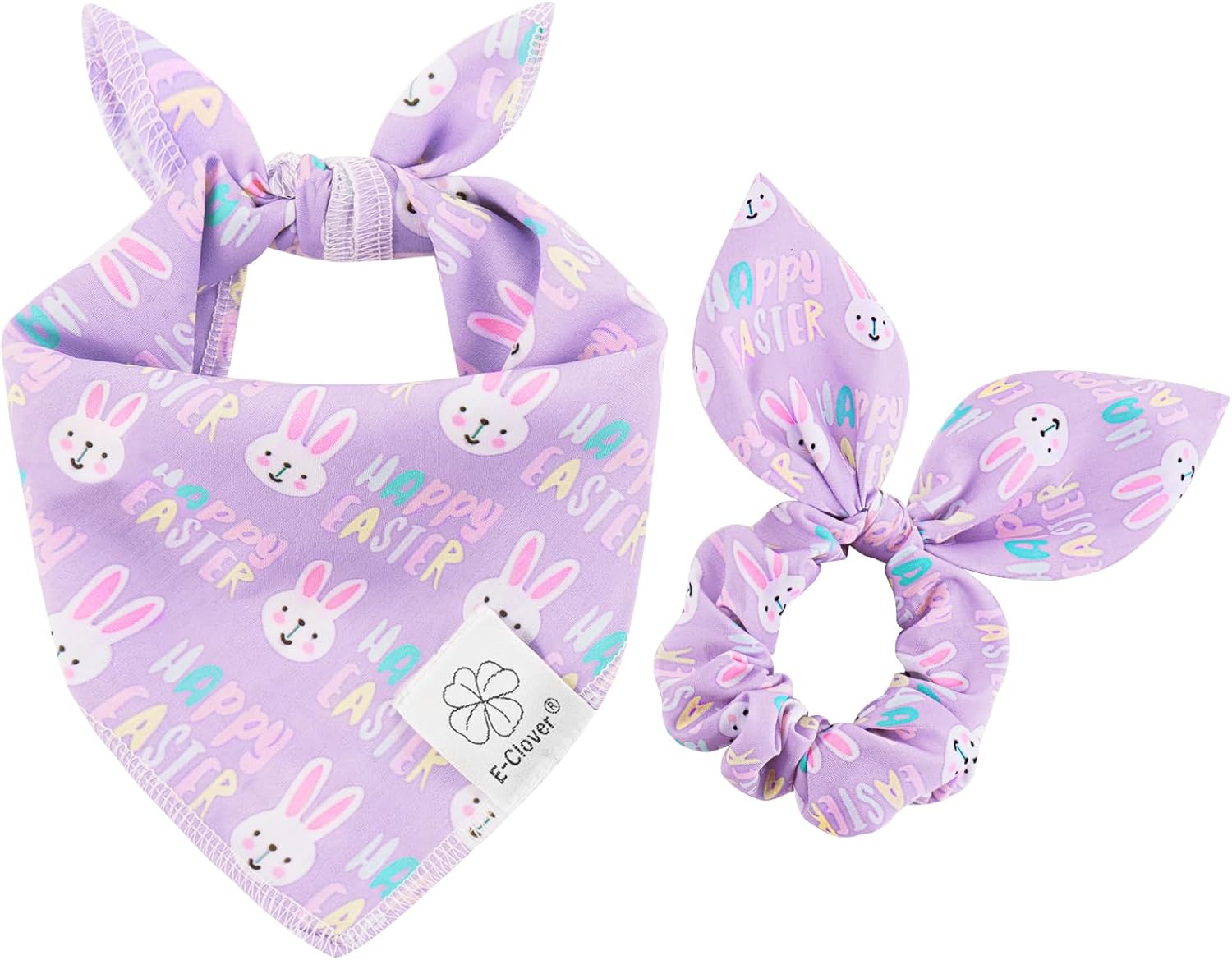 E-Clover Easter Dog Bandana & Matching Scrunchie-Bunny Dog Bandanas Pet Scarf Bib for Samll Dogs Puppy Girl Boy Owner Gift Purple