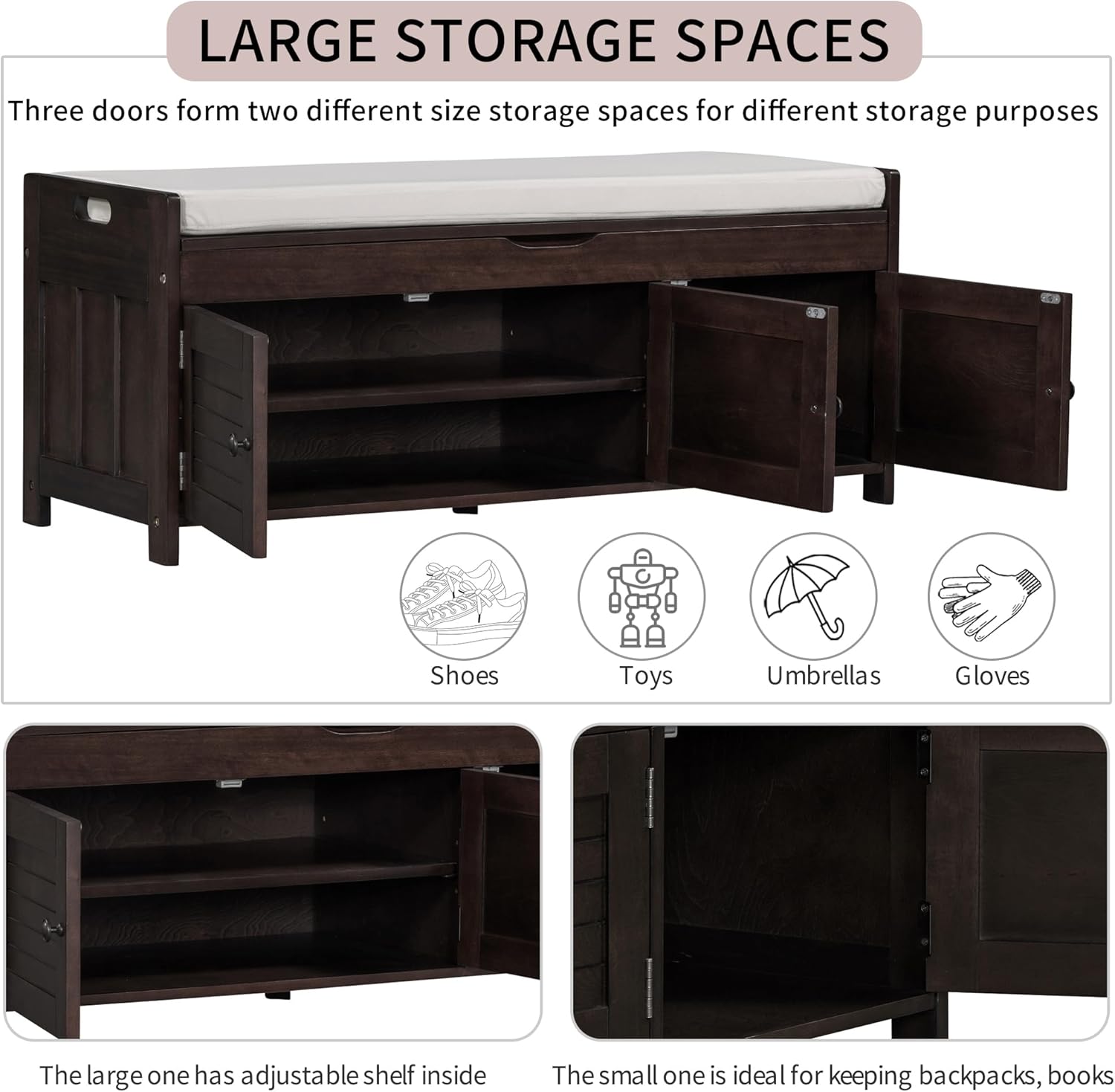 Shoe Storage Bench with 3 Shutter-Shaped Doors, Pine Wood Shoe Bench with Removable Cushion and Hidden Storage Space for Living Room, Entryway 43.5" L x 16" W x 18" H Espresso