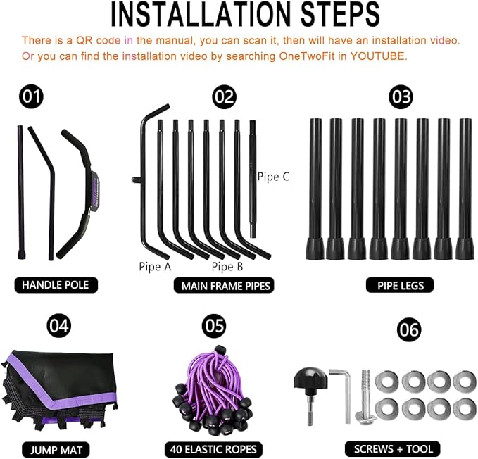 - 【NOTE】Trampoline equipment setup requires some physical labor-please read user manual or find the installation video by searching OneTwoFit in YOUTUBE for set-up and it is best having two people available set-up
