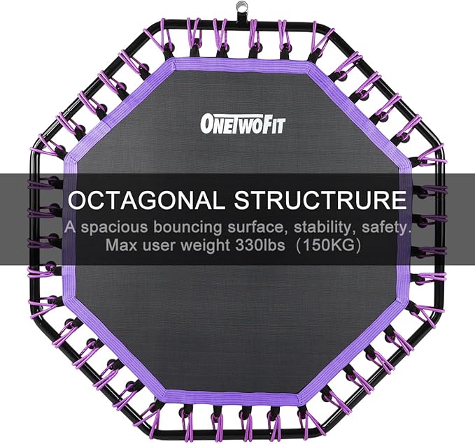 - 【Stable Structural Design】This fitness trampoline is made of STRONG PP MESH,anti-wear and tear resistant octagon rebounding surface,joint-friendly suspension by 40 bungee ropes,thick steel pipe which is 1.2"(30MM) of the diameter, 8 legs supports user up to 330 pounds(150kg)
