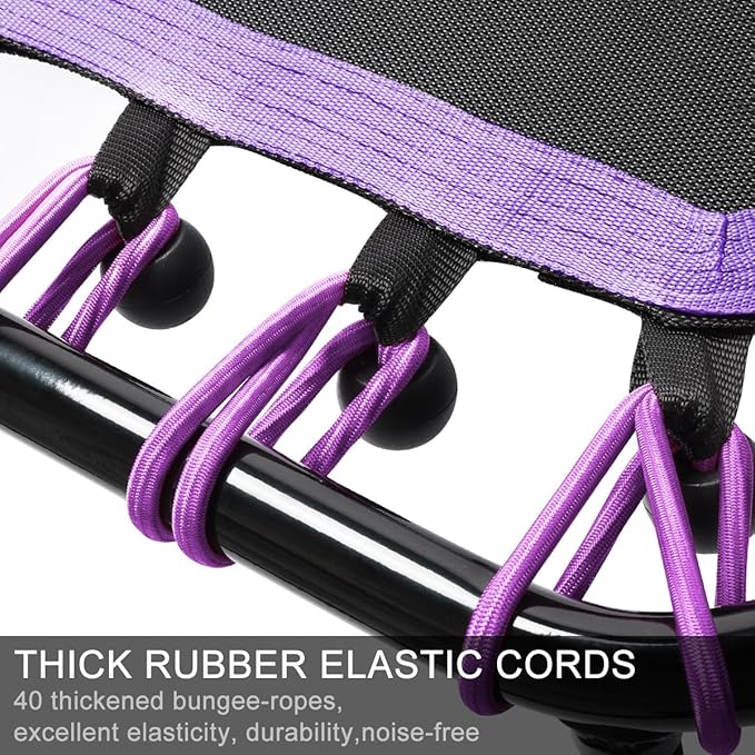 - 【Rugged Elastic System】Enjoy a spacious bouncing surface.The bungee-rope design system with 40 thickened ropes which are 0.32"(8MM) of diameter provides joint-friendly suspension, affords more stability, reduces noise in maximum extent, and gives you a great jumping experience. Special tool is included for assembly