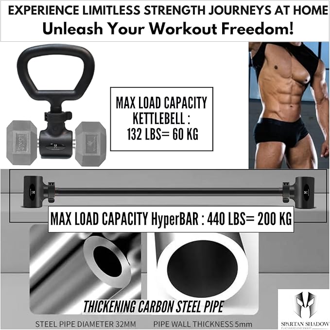 - 🎁 MAX WEIGHT Hyperbar 440 LBs = 200 KG & MAX Load capacity of KETTLEBELL 132 LBs = 60KG EXPERIENCE LIMITLESS STRENGTH JOURNEYS AT HOME: Unleash Your Workout Freedom! Indulge in the power of versatility with our Max Weight Dumbbell barbell converter bar, boasting an impressive 440 lbs (200 kg) capacity. Elevate your home workouts further with a Kettlebell that holds a maximum load of 132 lbs (60 kg). This Barbell Dumbbell Converter and Dumbbell to Kettlebell Converter redefine your strength training experience, empowering you to sculpt and evolve in the comfort of your home.Exercise at home. Let the weights speak to your potential, making every rep a step towards your fitness zenith.
