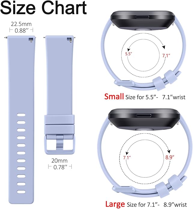 • Available in multiple colors and two sizes for Fitbit Versa 2 bands / Fitbit Versa bands / Fitbit Versa Lite bands women men, freely adjustable stainless steel buckle holds Versa sturdily. Each color is seemed like a brand new watch. Small Size fits for 5.5" - 7.1" (140mm-178mm) wrist. Large Size fits for 7.1" -8.7"(178mm-220mm) wrist.