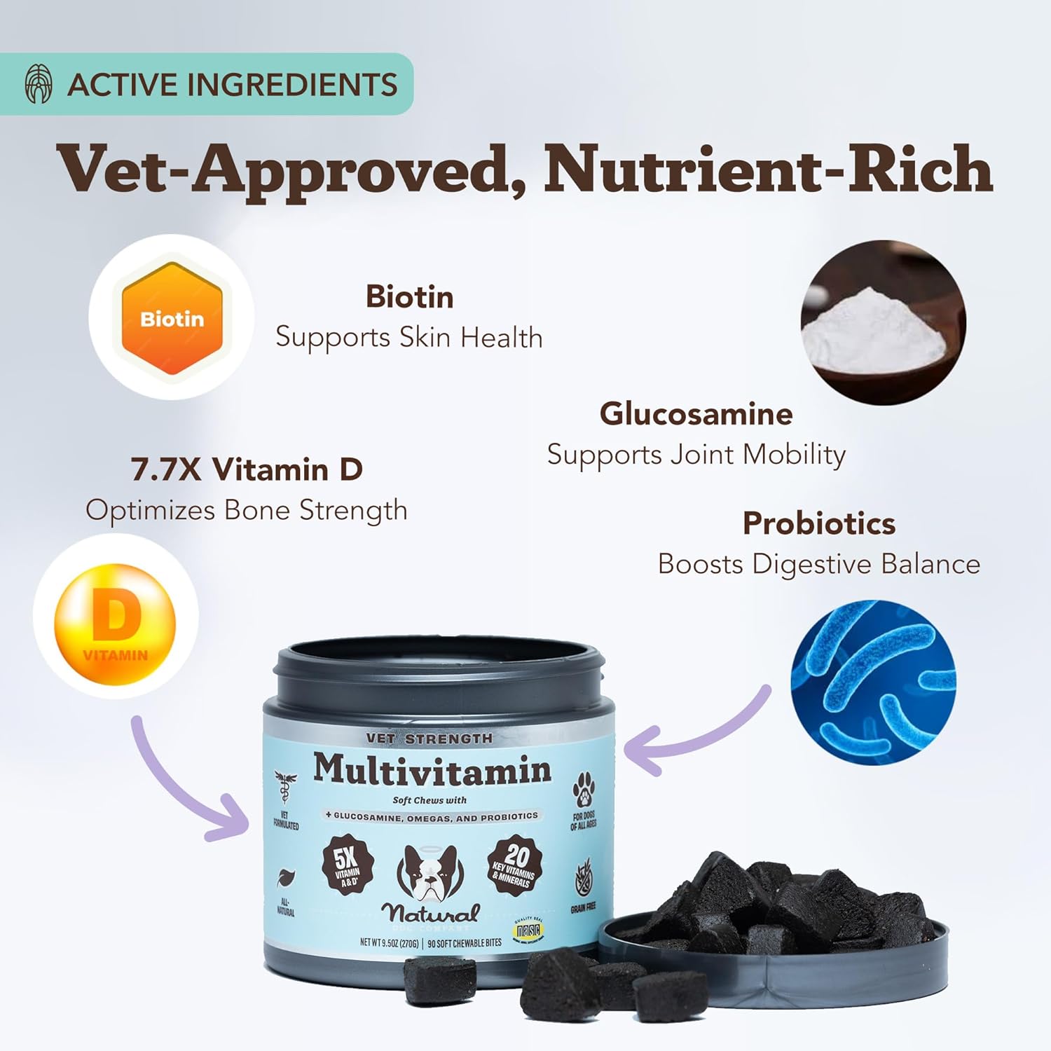 Natural Dog Company Vet Strength Multivitamin for Dogs – 90 High-Potency Soft Chews with Glucosamine, Chondroitin, Probiotics & Omegas – Supports Joints, Skin, Coat, Digestion, Immune & Heart Health