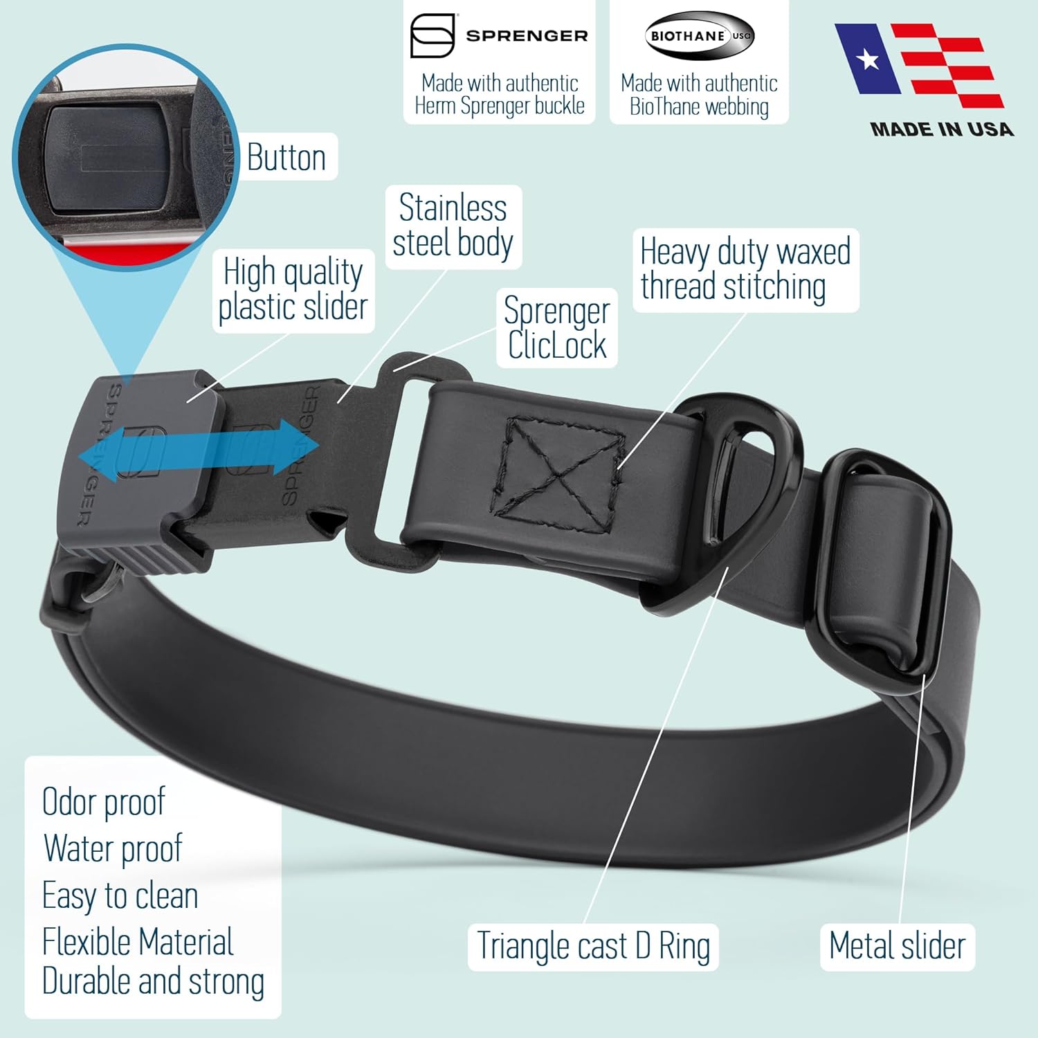 Dogline Biothane Waterproof Dog Collar with Herm Sprenger Stainless Steel Quick Release Buckle – Heavy Duty Tactical Durable Collar for Dogs – Comfortable and Safe Pet Collar, W 3/4" L 12-19", Black