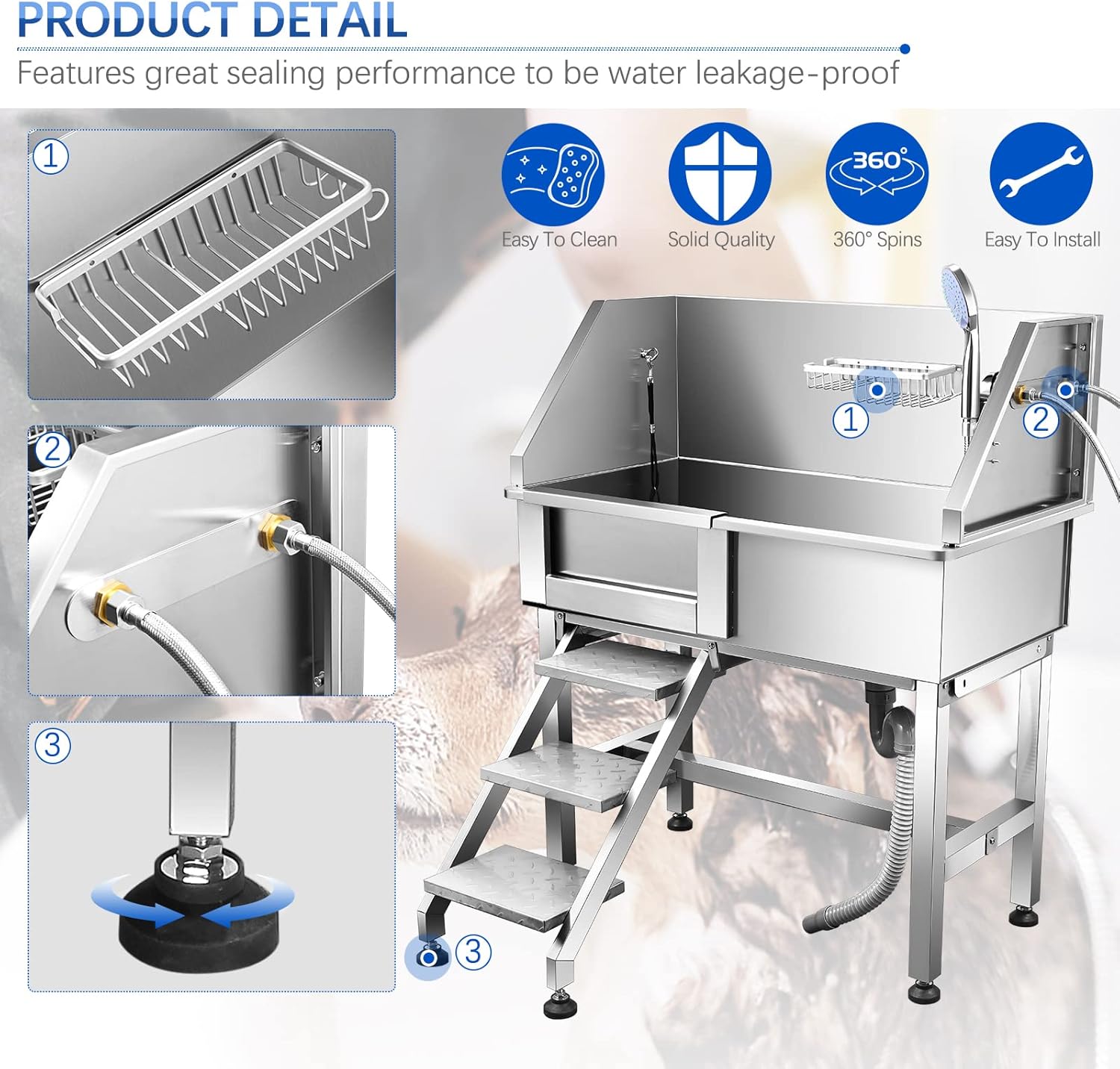 - Small & Sturdy - The dog bathtub's sink is made of 304 stainless steel that is high in quality. Heavy duty pet grooming sink is 34'' x 18''x 41''(back height) as accommodating various sizes of dogs, especially dogs (max capacity-180lbs), and perform long-lasting use due to its high grade stainless steel material