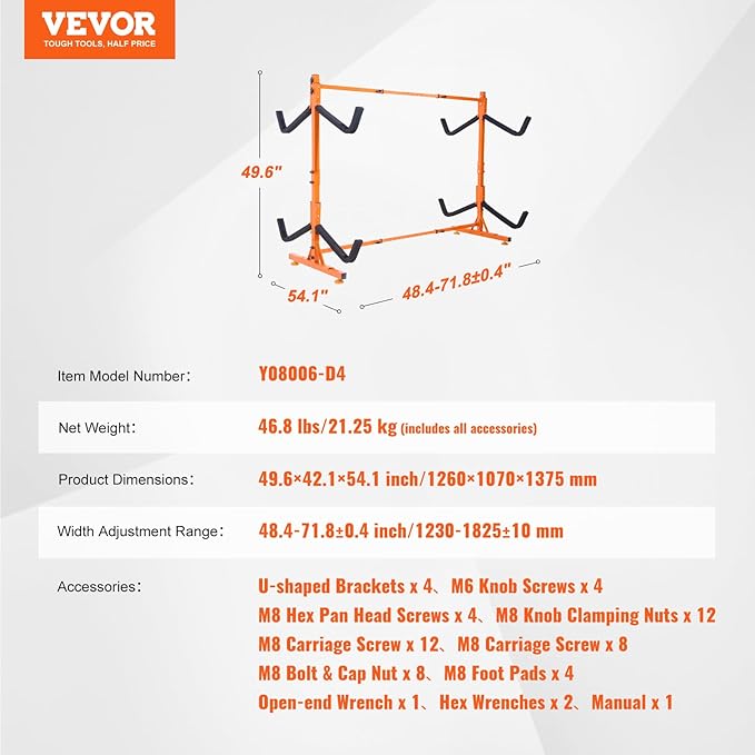 - Tool-Free Width Adjustment: Easily adjust the outdoor storage stand's width from 48.4 to 71.8 inch (1230-1825 mm) to accommodate various kayak sizes. With a 2.0-inch (50 mm) adjustment increment, you can quickly modify the width using hand screws included in the accessories. Ideal for storing long double kayaks or other large equipment.