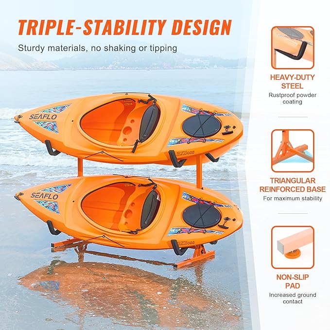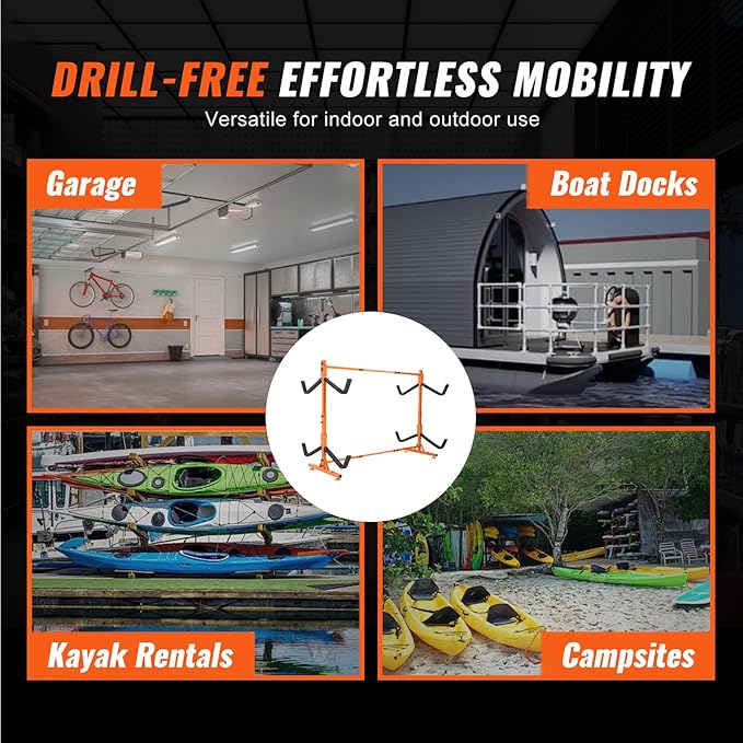 - Versatile and Durable: Our outdoor kayak storage rack requires no drilling for installation, making it easily movable between indoor and outdoor settings. The steel surface is treated with an anti-rust coating to withstand saltwater, sunlight, and rain. You can confidently place it in garages, boat docks, kayak rental shops, campgrounds, and more.