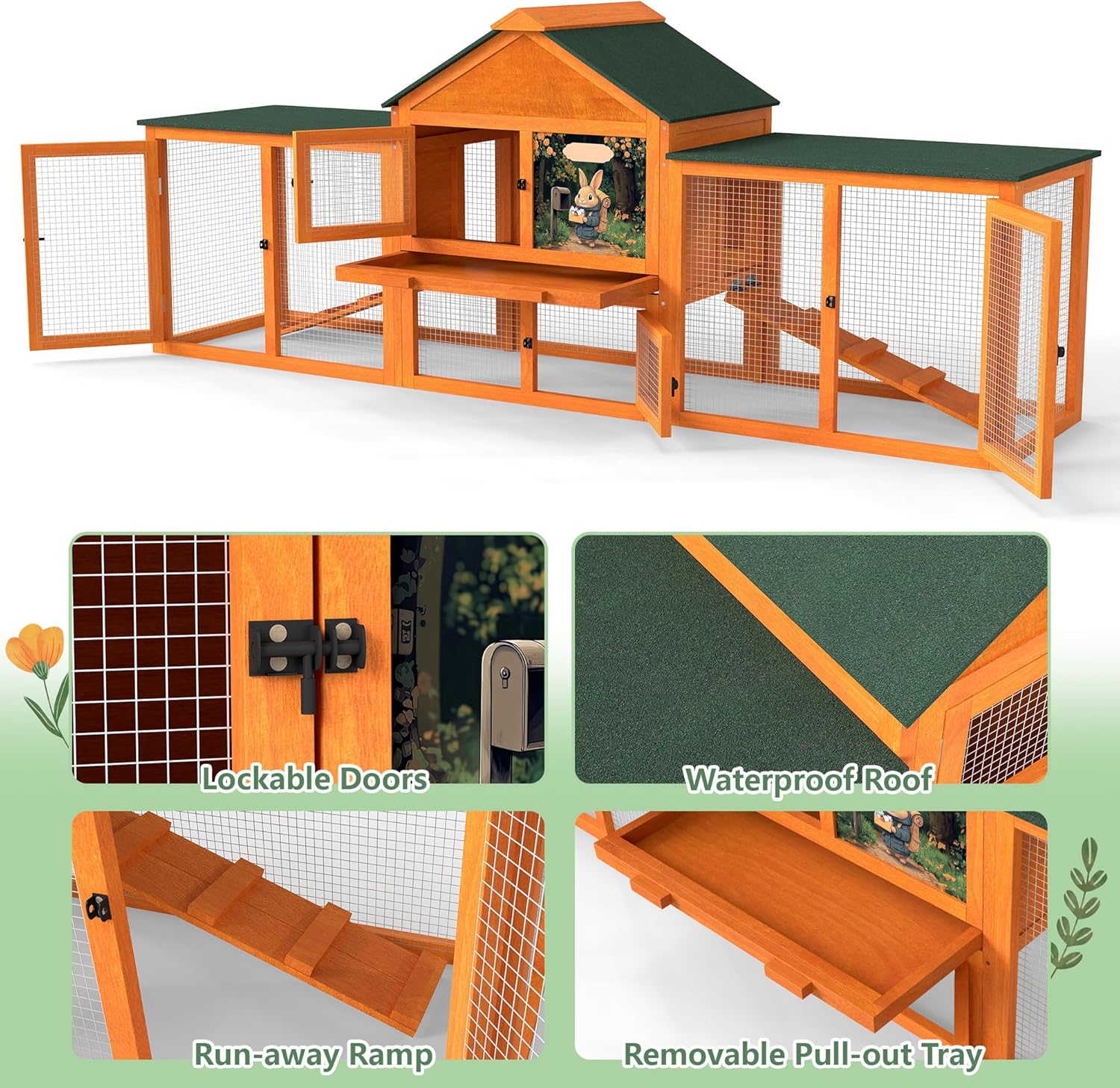 COZIWOW 82” Extra Large Fashion Wooden Outdoor Rabbit Hutch Bunny Cage Indoor Easy to Assemble and Durable with Cleaning Tray & Waterproof Roof for Small & Medium Bunny Rabbit Duck Chick (Orange)