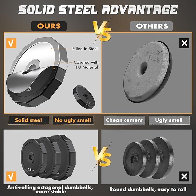 • Upgraded Solid Steel Material with Durable: Compared with the other cement material dumbbells on the market,our adjustable dumbbell set are made of solid steel,thinner,more durable, stable and true weight. Dumbbell weights plate coated is made of TPU material, high security, unbreakable,soundproof and protects the floor. Polygonal design prevents scrolling and makes for easy storage and use.Chrome connecting rod is knurled to ensure a firm grip,while the rubber-coated handle prevents slipping.