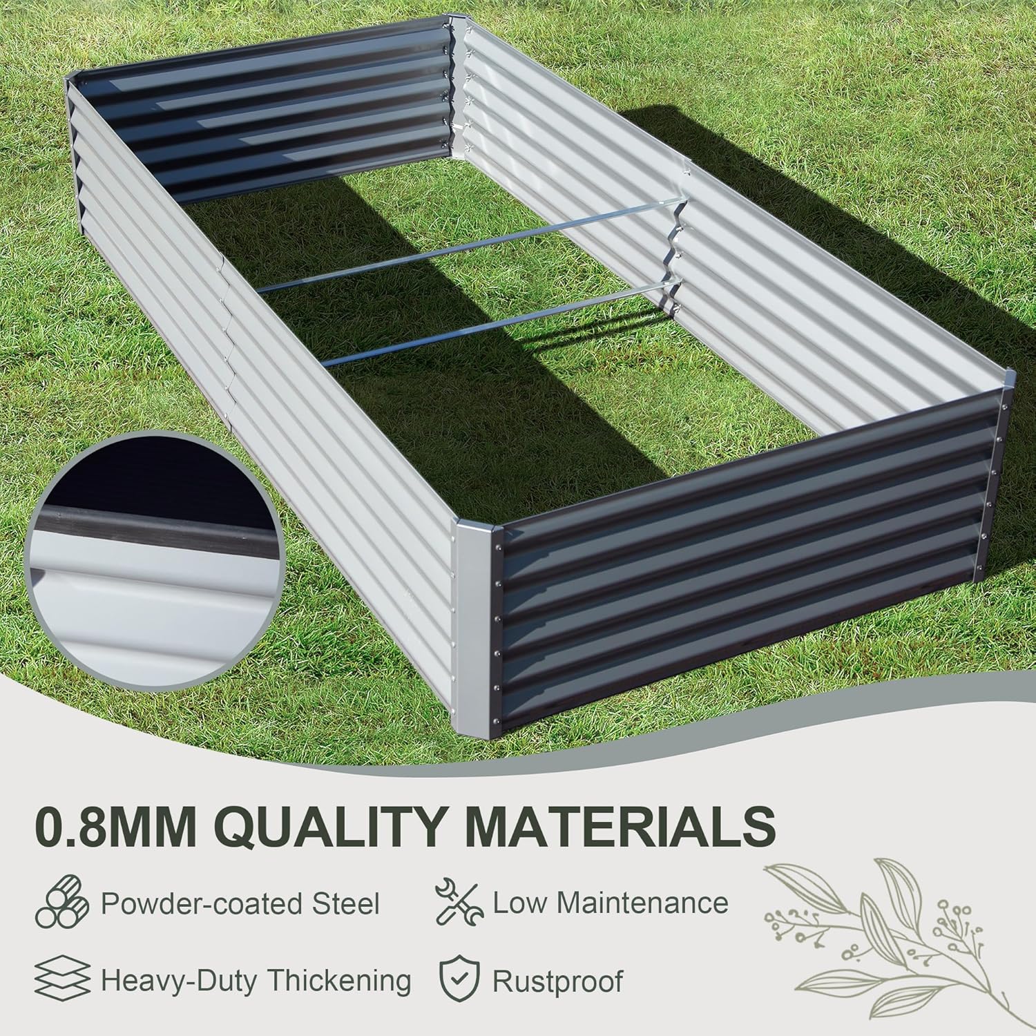 - Thicker Material: Made of thick galvanized steel plate with eco-friendly coating, rust-proof and durable. The 0.8 mm thickness, reaching 1.8 mm in the thickest part, ensures long-lasting raised garden beds' outdoor aesthetics.