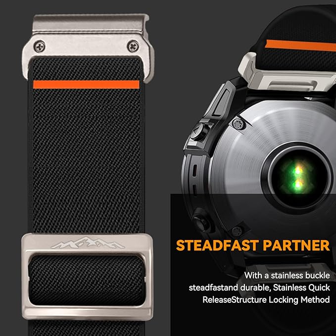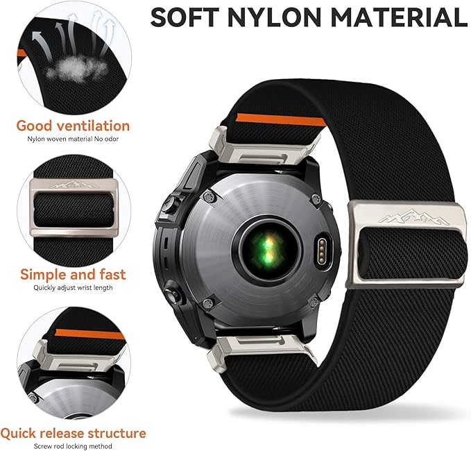 - 【User-Friendly Material】Compatible with Garmin Fenix 7/7 Pro/Fenix 6/6 Pro/Fenix 5/5 Plus Band Elastic Nylon Braided Strap is made of high quality stretchy nylon, super soft and lightweight, breathable and comfortable. This eco-friendly nylon and the sweat-absorbing property make this strap super skin-friendly.
