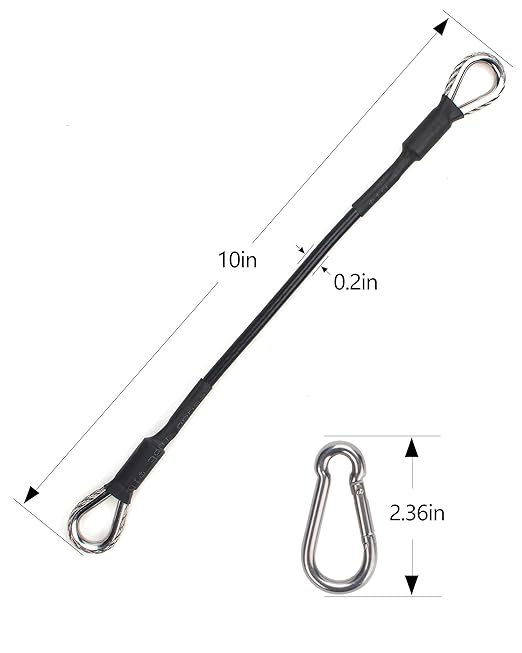 - Product Size: Fitness extension cable is about 10 inches/25.4 cm long; carabiner is about 2.38 inches/6 cm long.