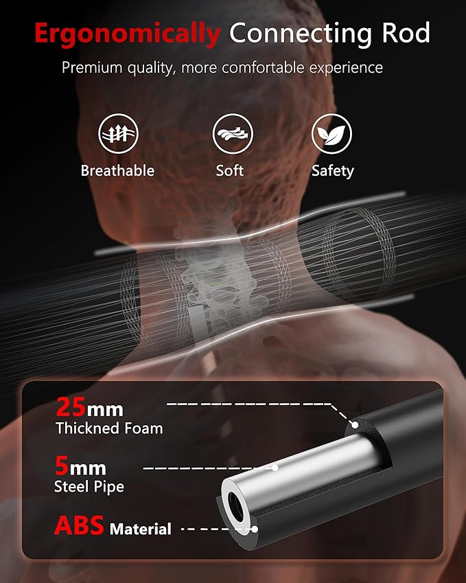 - 20MM Thickened Foam:The connecting rod is made of a 5mm thick steel tube + 20mm thick high-quality foam. Curved design fits the neck, which is non-slip and sweat-absorbing, soft and breathable, bringing a more comfortable exercise experience to you