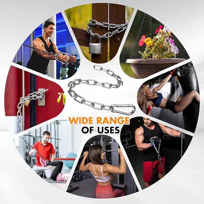 • Multi-Functionality:As a cable extension accessory for workout machine, the steel chain can be used for a variety of training programs, such as pull downs, curls, squats, hard pulls, bench presses, etc. It is suitable for use in strength racks, pulley systems, and weight lifting equipment, providing trainers with more diversified training choices. It can also be used for sandbags, locking gates or bicycles, fences and other